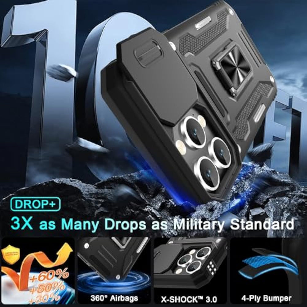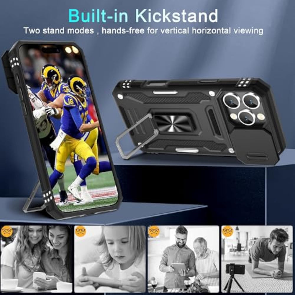 | Armor Case With Sliding Camera Cover Specially Designed For Iphone 16 Pro-6.3 Inch (2025 Released). Not Fit For Other Device! The Precise Cut Out Fits Each Button,Camera,Speakers And Ports Precisely, Easy To Press And Access | | Military Grade Protection: Double Layer Shockproof Case Made By Tpu+Pc.This Multi-Layer Cushion Structure Provide Additional Shock Absorption Protection.Certified By The Military Standard,Survived Over 8,000+ Drop Tests From Up To 8Ft!The Flexible Tpu Interior Absorbs Impacts From Inside.In Addition,Exterior With Four Reinforced Corners Can Effectively Absorb The Impact Of Falling | | Camera And Screen Protection: Sliding Camera Cover Protect The Phone Case Camera Lens From Getting Scratched And Scuffed.Subtly Enhanced 1.8 Mm Screen Lips And Glass Screen Protector Provide The Screen Extra And Comprehensive Protection.Ensuring Every Aspect Of Your Phone Is Protected With Uniquely | | Magnetic Ring Kickstand: Newly Upgraded Multi-Function Case Built-In Ring Kickstand And Metal Patch.Rotating Ring Provide Two Stand Modes For Vertical Horizontal Viewing,So It Can Be Used As Ring Holder And Release Your Hand When Watching Video.The Metal Patch Back Easily Attach To Magnetic Car Mount,Very Convenient During Driving Time For Navigation.You Will Love How Convenient It Is With Such Powerful Functions | | What'S You Get: The Package Come With 1 Pack Phone Case And 2 Packs Screen Protector Tempered Glass. Notice: Due To The Metal Ring On The Back,This Case Will Not Work With Wireless Charging Function. | |