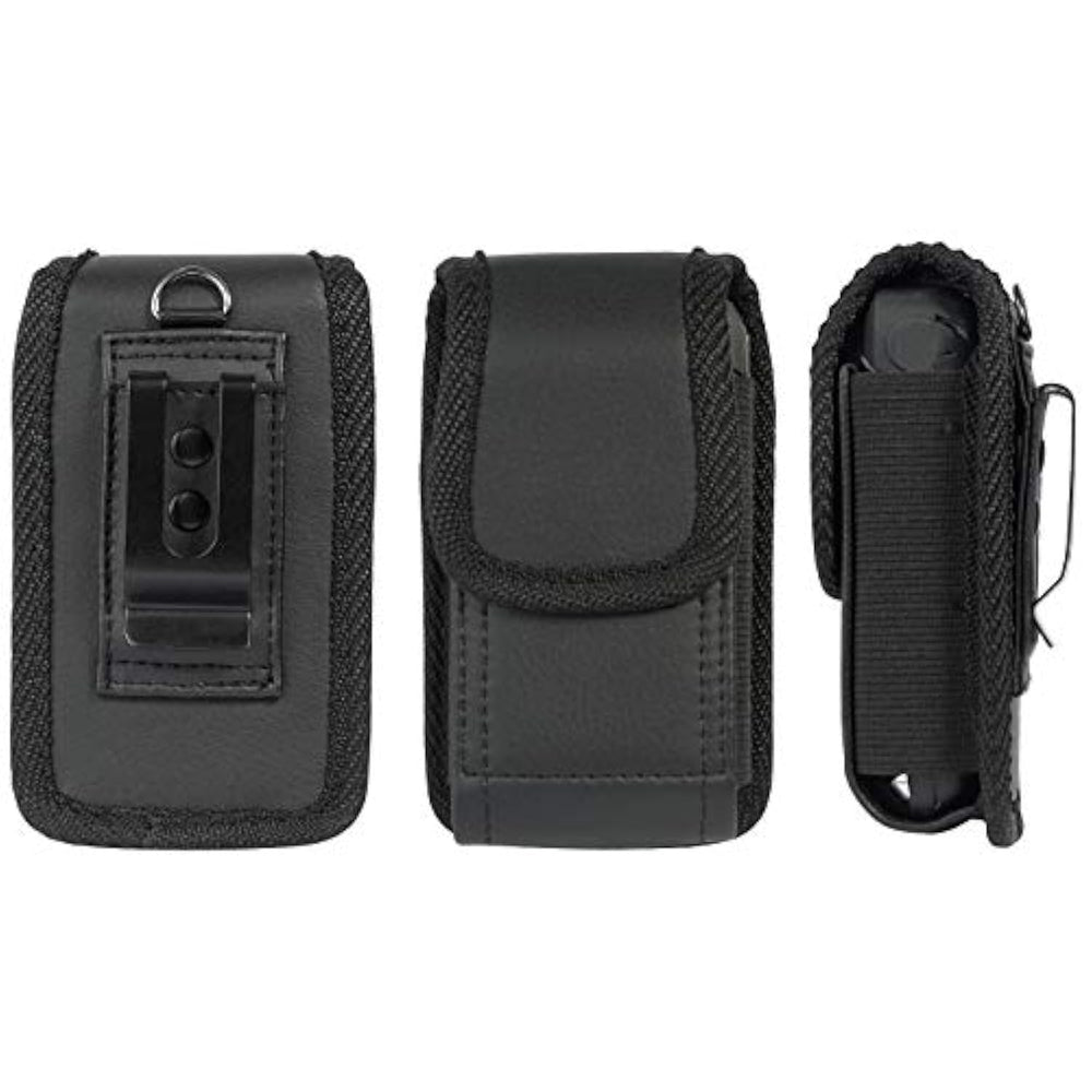 | Premium Vegan Leather Pouch Case with Rugged Nylon Trim Keeps Phone Protected and Concealed | | Free Your Pockets and Carry Your Phone in Comfort at Your Side with Quick Access | | Fixed Metal Clip with Low Profile Secures to Belt or Waistband | | Rear Sleeve/Loop to Thread Belt for Extra Stability | | Magnetic Closure Keeps Case Closed Shut and Secure - Universal Design for Thick/Rugged Flip Phones | |