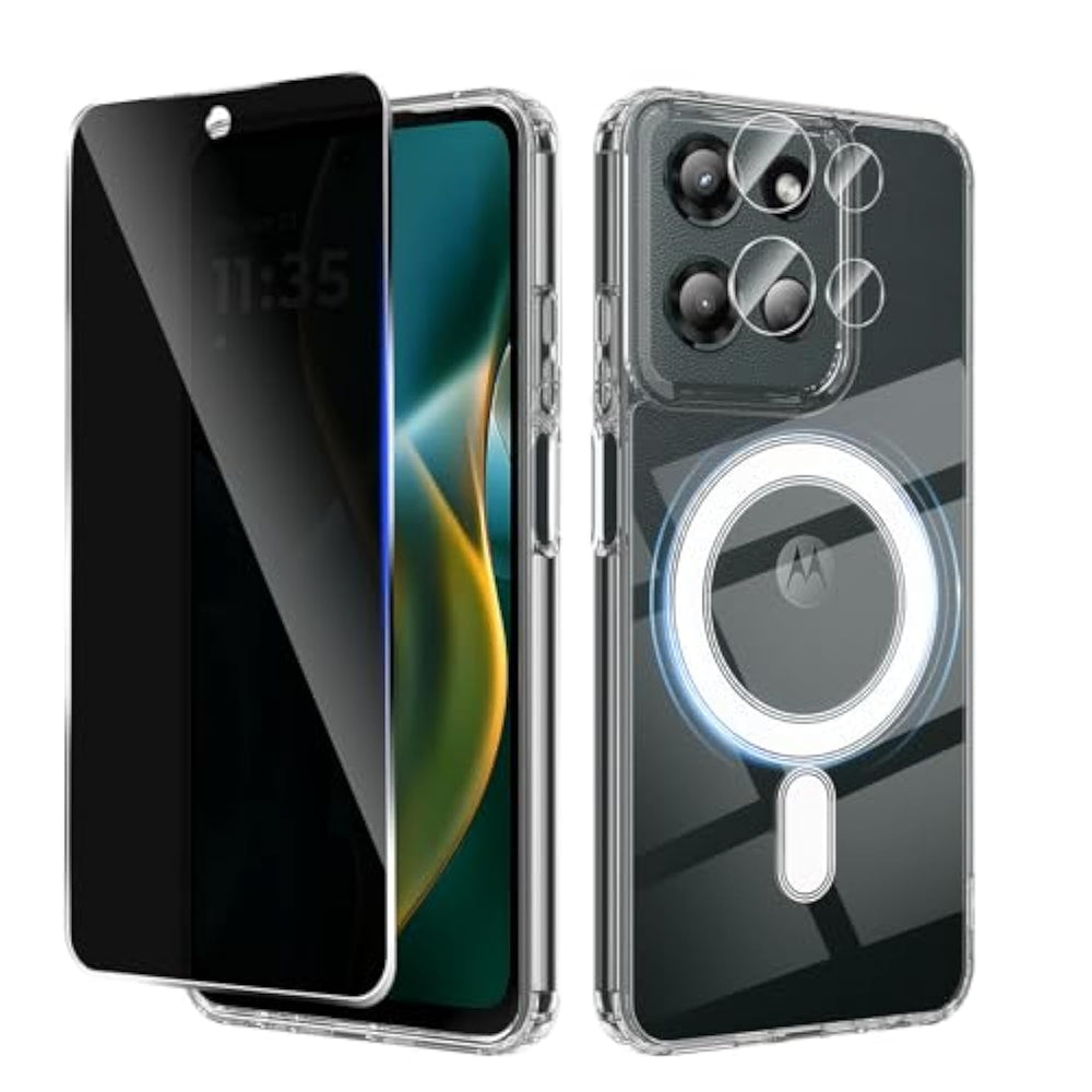 | ?Powerful Magnetic Attraction?The Moto G 2025 Case Has Super Adsorption Capacity.Moreover,It Is Compatible With All Magnetic Accessories And Third-Party Qi-Certified Wireless Chargers.And The Perfectly Aligned Magnetic Attraction Makes Wireless Charging Faster And More Stable. The Powerful Magnetic Force Provides Enhanced Stability, Bringing More Comfort To Your Life. | | ?Certified Military Grade Drop Tested?The Design For Moto G 2025 Case Is Military Grade Drop Protection By Unique Airbag Design.This Shockproof Bumper Phone Case Certified Mil-Std Drop Test,Offer Toughest Protections For Your Phone From Drop, Scrapes, Dirt, Bumps And Shock. It Can Absorb Shock And Prevent Impact From Causing The Phone To Break, Effectively Protecting Your Phone. | | ?Crystal-Clear Anti-Yellowing?The Clear Case For Moto G 2025 Is Made From The Industry'S Finest German Bayer Material For Unparalleled Clarity. Which Can Effectively Resist Yellowing Caused By Ultraviolet Rays And Sweat.Meanwhile, The Case For Moto G 2025 Also Adopts Unique Ergonomic Design To Make The Independent Buttons Feel Sensitive And Easy To Press, Brings You Excellent Skinny Touch | | ?Camera Privacy Screen Protection?The Raised Edges Of The Moto G 2025 Phone Case Offer Additional Protection For Camera, And The Included Rear Camera Lens Protector.The Case Built-In Privacy Screen Protector Film Is Made Of 9H Hardness Tempered Glass To Keep Your Screen Invisible To Others. The Screen Can Only Visible To The Person In Front. Good Choose When You Are In The Bus,Elevator,Metro Or Other Public Occasions. | | ?Very Important?After Installing The Protector, You Need To Re-Record Fingerprints. In This Way, You Will Get A Perfect Fingerprint Unlock And Super Fast. The Bundle Includes: [1X Phone Case For Moto G 2025 ; 1X Privacy Screen Protector; 1X Camera Protector.] [Includes Cleaning Kit]. We Are Committed To Providing Good Service To Every