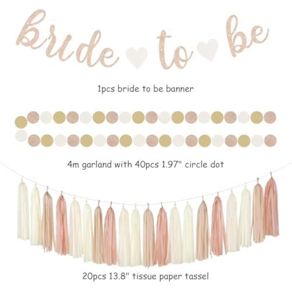 | ?Package Content? Champagne Gold Beige Fall Bridal Shower Party Decorations Contains: 1 Pcs Bride To Be Streamers Banner, 1 Pcs Circle Dots Paper Banner, 2 Pcs Paper Lanterns, 4 Pcs Tissue Paper Pom Poms, 2 Pcs Paper Fans, 6 Paper Swirls And 20 Pcs Tassel Garland, Total 36 Pcs In 8 10 12 Inch And Champagne Gold Beige Color. | | ?High Quality Material? These Rose Gold Bride To Be Bachelorette Party Supplies Are Made Of High Quality Eco-Friendly Paper, Durable And Reusable. Suitable For Various Theme Parties, Perfect For Creating A Festive Atmosphere. | | ?Wide Application? It Can Be Decorated On Ceiling,Table,Window,Office Wall Backdrop,Etc.Suitable For Boho Bachelorette Party, Bride To Be Party, One Sweet Peach Bridal Shower, Wedding Shower Party Decor. | | ?Easy To Assemble? Paper Fans And Paper Lanterns Already Pre-Folded Which Are Easy Assembly. Tissue Paper Pom Poms Take More Time To Put Together ,Which Will Takes About 20 Minutes. It Will Be Great Fun If You Invite Friends And Familyto Diy Them Together. | | ?Warm Tips? If You Are Not Satisfied With The Color, Quality Or Any Other Aspect, Please