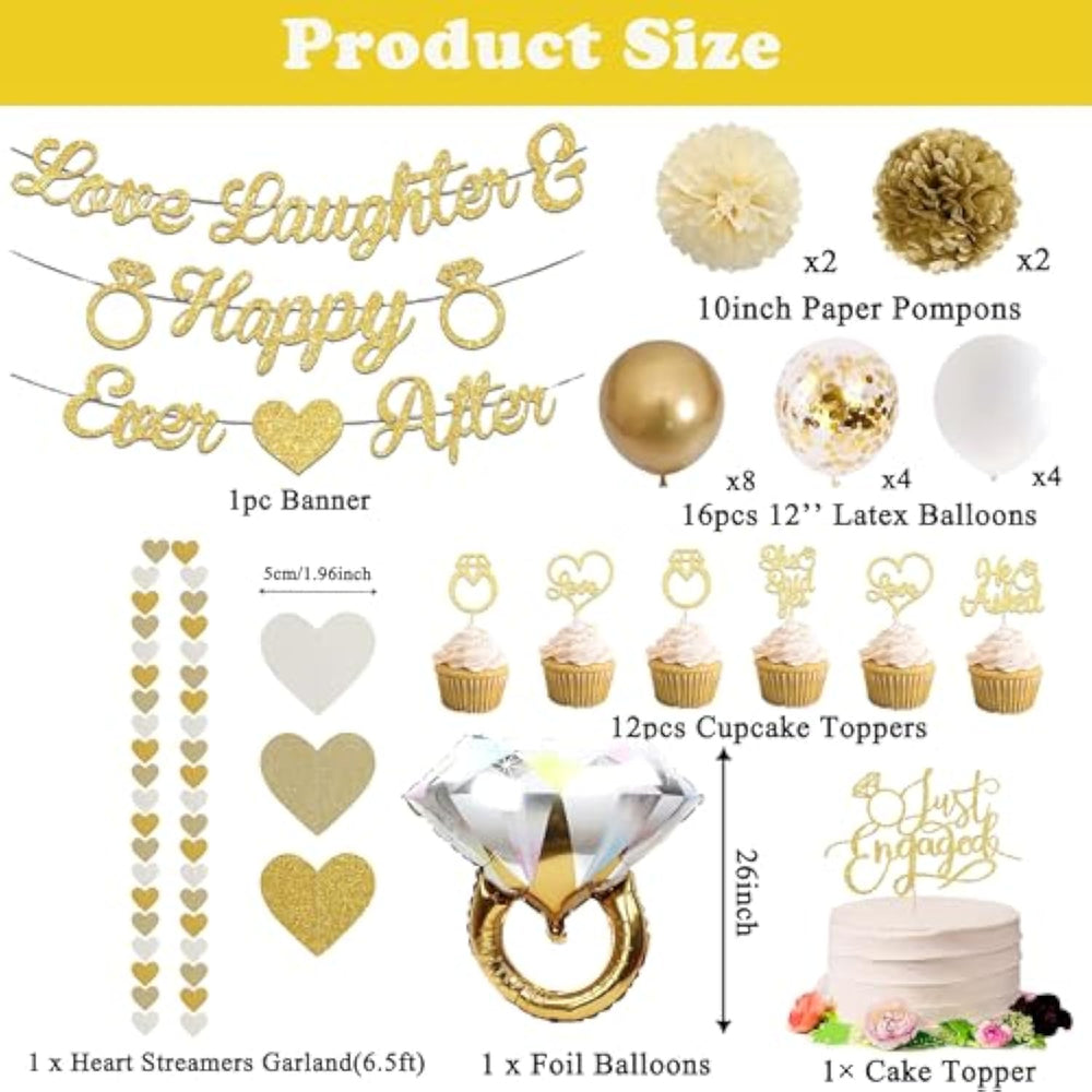 | ?? Engagement Decorations Kit Contains Everything You Need: A Romantic "Love Laughter Happy Ever After" ?Engagement Party Sign, 8 Eye-Catching 12-Inch Latex Balloons (4 Light Gold Metal, 4 White Matte, 4 Transparent Gold Glitter), A Dazzling 68X61Cm Gold Diamond Ring Foil Balloon, 6 Elegant Gold Paper Cupcake Toppers, 1 Chic Gold Large Cake Topper, 4 Fluffy 10-Inch Paper Pompoms (2 Beige, 2 Khaki), And A Delightful 2M Heart Tassel Garland—Totaling 22 High-Quality Pieces To Transform Your Space Effortlessly. | | ?? Transform Any Venue With These Versatile ?Engagement Party Supplies, Ideal For ?Engagement Party? Celebrations Both Indoors And Outdoors; Hang The Banners And Balloons At Entrances Or Walls To Create A Magical, Welcoming Atmosphere That Impresses Guests And Immortalizes This Memorable Moment. | | ?? Experience Stress-Free Planning With Our Complete ?Happy Engagement Decorations; No More Store-Hopping—Just Unpack And Start Assembling! This Ready-To-Use Bundle Saves Time And Energy, Letting You Focus On Celebrating Love With A Rich, Elegant Party Setup For A Truly Unforgettable Event. | | ? Layered Happy Engagement Decorations: Glitter Balloons Sparkle, Matte Balloons Glow Softly, Pompoms Add Cozy Depth. Everything Harmonizes In Champagne Gold Tones For Elegant Photos. | | ?? Exclusively For Engagements: Every Detail Celebrates "Just Engaged" Joy! Heart Banner Symbolizes Commitment, Ring Balloon Highlights Your Milestone. True ?Engagement Party Decor? Starter Kit. | |