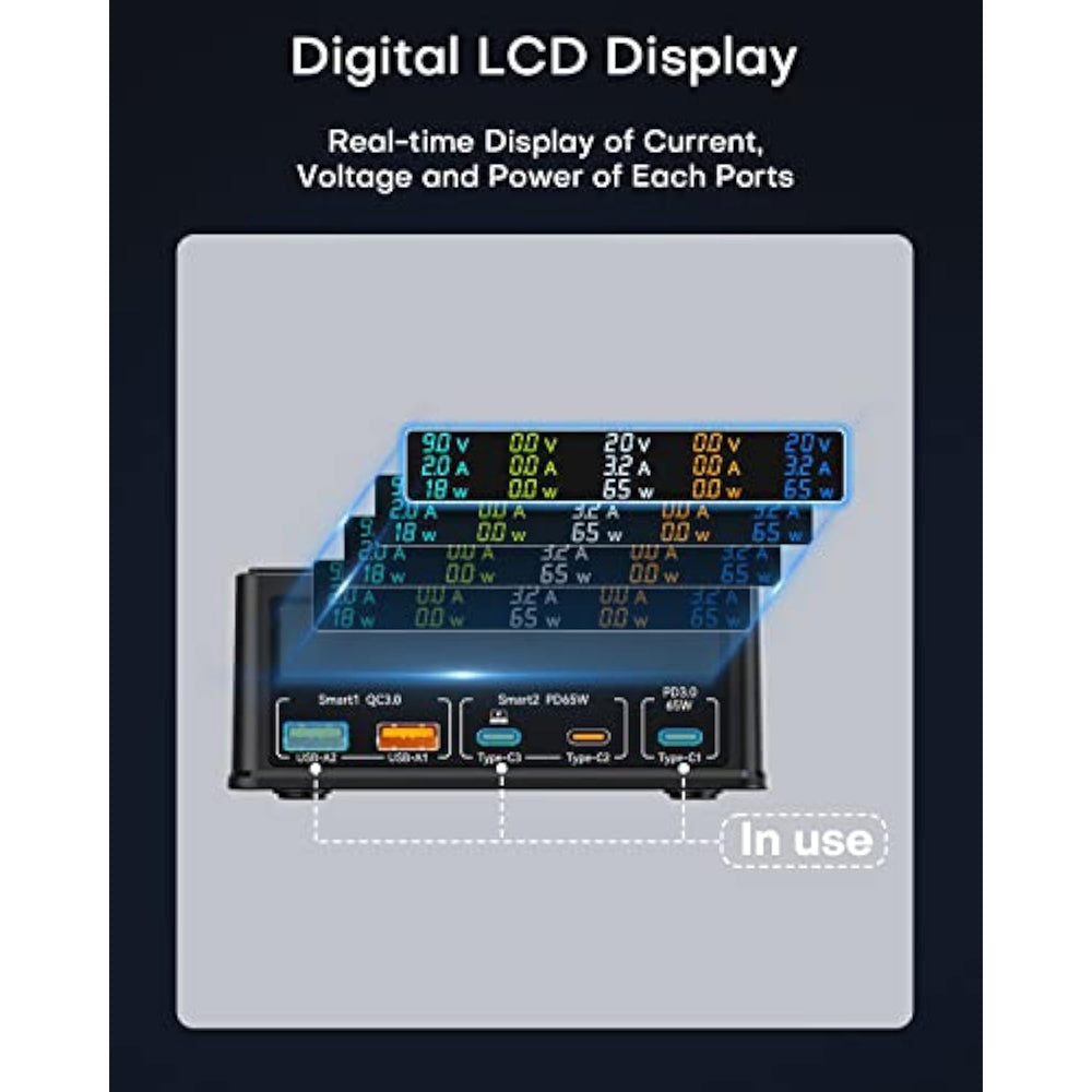 | ?65W Pd Fast Charging Station?: 5 Ports Usb Charging Station Supports All Devices Charging At The Same Time.Includes 65W Max Usb C Pd3.0 Fast Charging,Qc3.0 Quick Charge,And Wireless Charging.Usb-C Port Up To 65W Max Output,Support Full Speed Pd Charging For Laptops.The Multi Usb Charger Station Compatible For Macbooks,Laptops,Smart Phone,Ipad,Tablet,Bluetooth Earphone And Multiple Devices. | | ?6-In-1 Usb Charger?: 160W Multiple Usb Charging Station Designed With Three Parts Smart Outputs.This Desktop Usb Charger Station With Two Usb-C Ports (Up To 65W Max) Supporting Pd (Power Delivery) 3.0 And Qc4+/Pps/Afc/Fcp Protocols.Qc3.0 Is Up To 18W Max.The Wireless Charging Output Compatible With 5W/7.5W/10W/15W,Smartly Equip Your Different Devices With The Best Power To Achieve The Fast Charging Speed. | | ?Smart Lcd Display?: Charging Station For Multiple Devices Equipped With An Lcd Digital Display,Shows The Real Time Voltage,Current And Power Of Each Port.The Usb C Charging Station Equipped With A Screen Touch Button,Which Can Be Turn On Or Turn Off At Any Time Without Affecting Sleeping. | | ?Wide Compatibility And Safety?: The Usb Charger Hub With Anti-Fire Pc+Abs Material.Built-In Overvoltage, Overheat, Overcurrent, Short Circuit Protection.Simple And Durable, Save Space, Realize Multiport To Charge Different Devices.The Charger Station Suitable For Home, Office, Travel Etc. | | ?What You Will Get ??5 Port Usb Charging Hub With 4 Ft / 1.2M Ac Power Cord, Usb-C To Usb-C Cable 100W 3.3Ft With E-Marker Chip, User Manual , Our 12 Month And Friendly