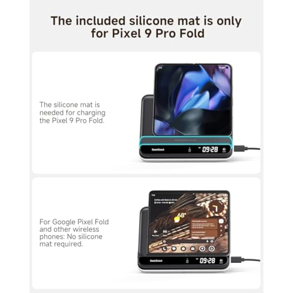 | Designed For Google Pixel Fold Series: The 710Fg2 Charges Both The Pixel Fold Series And Pixel Watch (Not For Pixel Watch 1), Reducing The Need For Multiple Cables And Chargers While Keeping Your Desk Neat And Organized (Note: When Charging The Pixel Fold Series In Its Unfolded State, Align It To The Far-Right Position On The Charger For Optimal Efficiency) | | Fast Charging: Power Up Your Google Pixel Devices Faster. Fully Charge Your Google Pixel 9 Pro Fold In Just 3 Hours And 15 Minutes And Your Pixel Watch 3 (Not For Pixel Watch 1) In Only 1 Hour And 15 Minutes—Significantly Faster Than Standard Chargers | | Note For Google Pixel 9 Pro Fold: Before Charging Your Google Pixel 9 Pro Fold Please Place The Included Silicone Mat On The Wireless Charging Dock. This Accessory Is Specifi