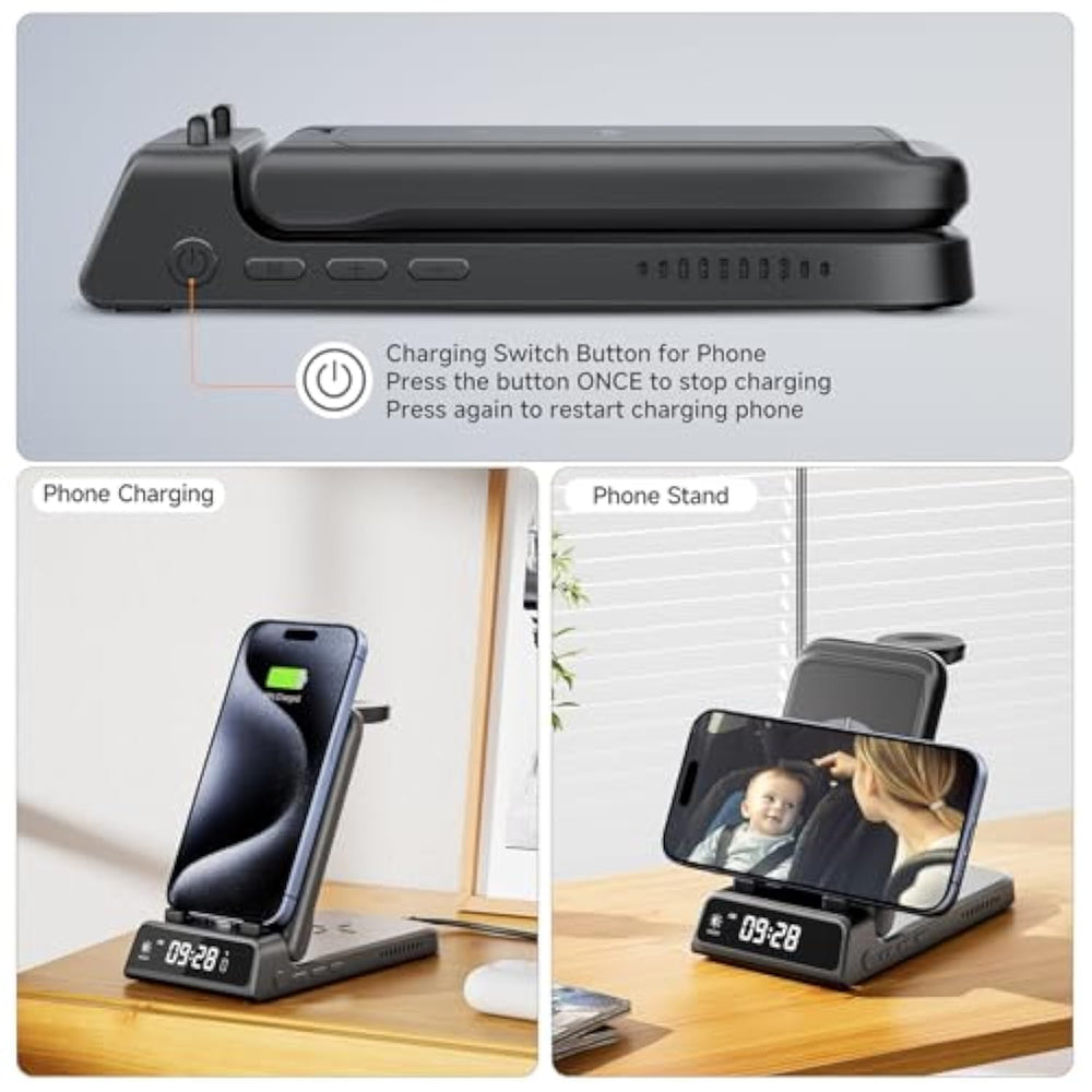 | 4 In 1 Wireless Charging Stand: The 703A Is A 4 In 1 Wireless Charging Station Capable Of Charging Multiple Iphone Devices, Enabling You And Your Family To Conveniently Charge All Devices Simultaneously. With It, You Can Indulge In Effortless And Elegant Wireless Charging (Note: The Phone Case Should Be Thinner Than 5Mm (?5 Mm/0.19 Inch)) | | Compatibility: The 703A Is Compatible With Iphone 16/15/14/13/12/11 Series (Not For Iphone 13 Mini/12 Mini). It Also Compatible With Samsung S25 Ultra/S25+/S25/S24 Ultra/S24+/S24/S23 Ultra/Z Fold6/Z Flip6/S23/S23+/S22 Ultra/S22/S21 Ultra/S21/S20/S20 Ultra/Note 20, Etc. Only Compatible With Apple Watch Ultra 2/Ultra/Se 2/10/9/8/7/6/3/2/1/Se 2/Se. For Airpods Pro 2/Airpods 4 (Anc)/Airpods Pro/Airpods 3 And Other Earbuds With Wireless Charging Case | | Stop Or Start Charging Button: The 703A Features A Button To Stop Or Start Charging Your Phone. When Your Phone Is Fully Charged, Simply Press The Button To Stop Charging, And It Will Function As An Ordinary Phone Stand. Press The Button Again To Resume Charging Your Phone | | Portable And Foldable, Great For Travel: This Wireless Charger Station Is Foldable And Portable, Allowing You To Take It With You Wherever You Go, Whether You'Re At Home, At The Office, Or On The Go, The 703A Is The Great Accessory For All Your Charging Needs | | Adjustable Clock Design: Keep Track Of Time At A Glance With The Built-In Clock. The Brightness Is Adjustable, Ensuring It Won’T Disturb Your Sleep. | | What You'Ll Get: You'Ll Get 1X 703A, 1X Charging Cable, 1X Qc 3.0 Charger Adapter And Friendly