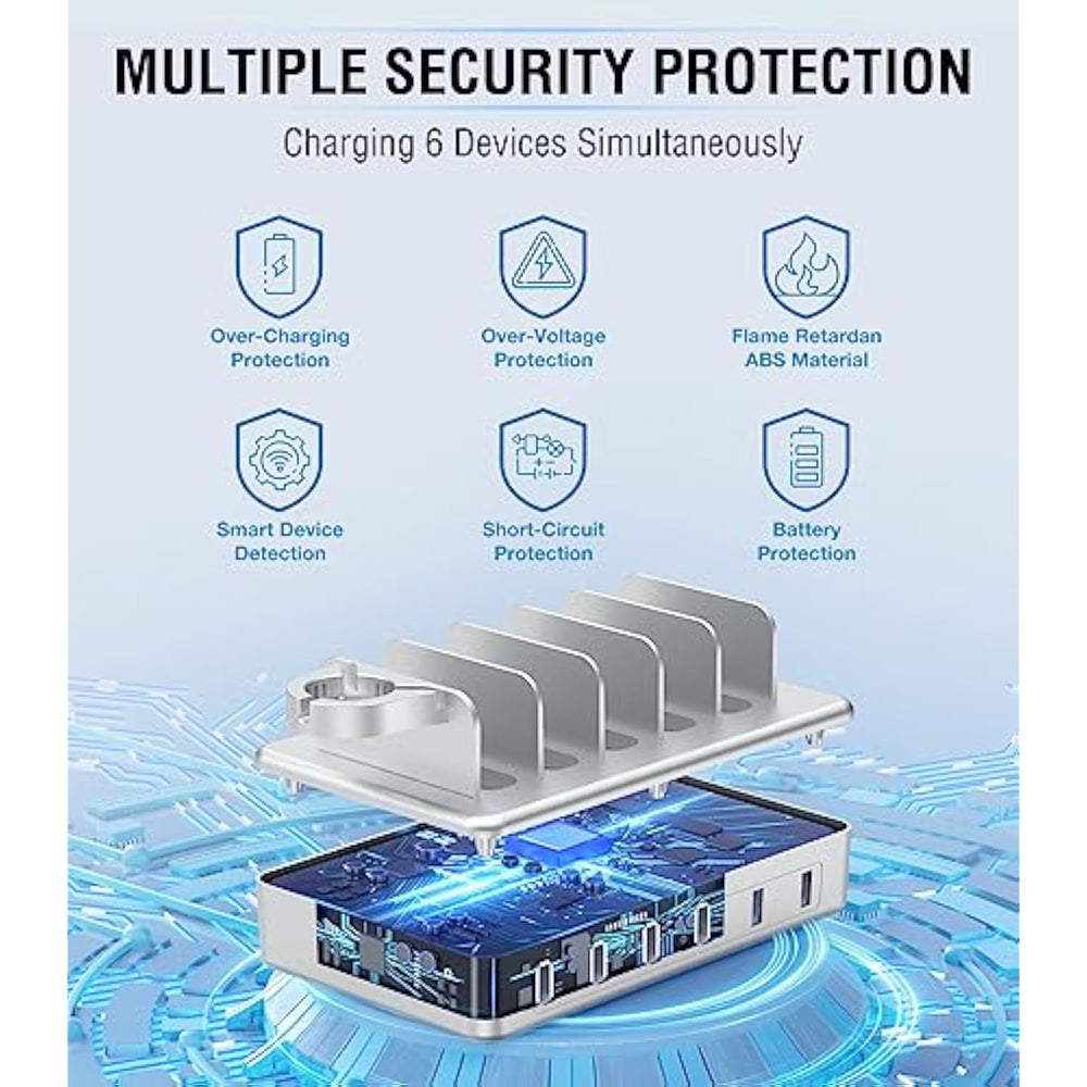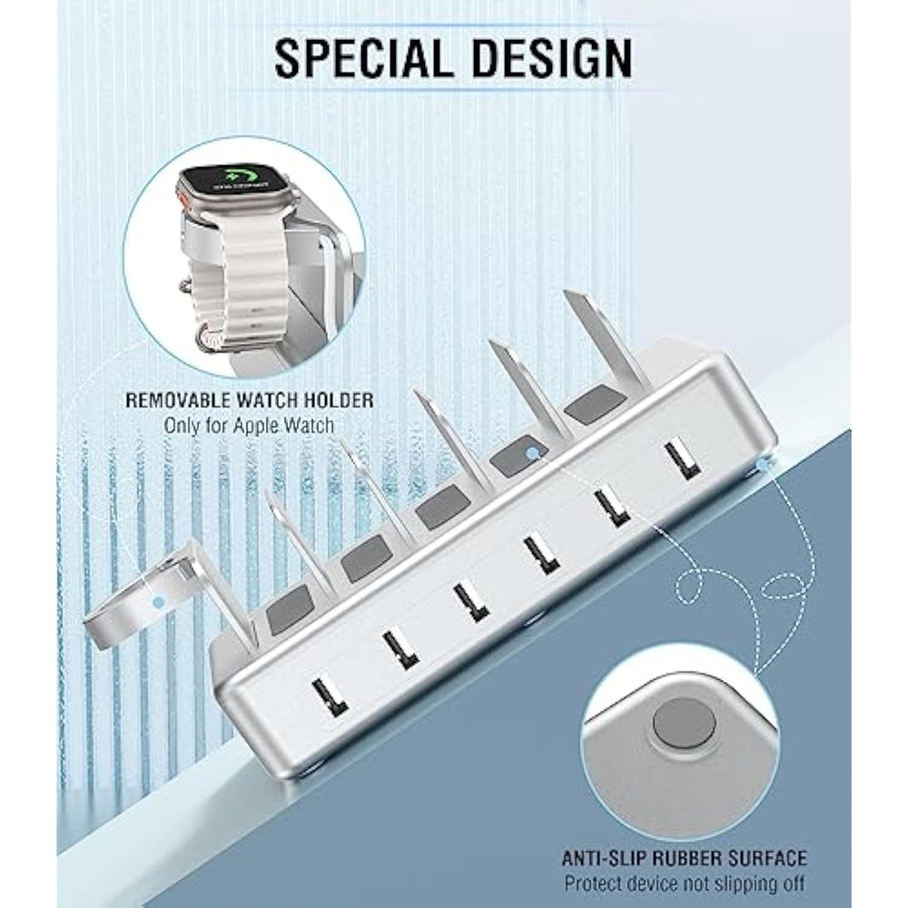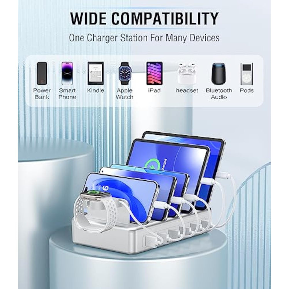 | ?6 In 1 Multiple Charging Station?The Charger Station For Apple Devices Has 6 Usb Ports That Will Charge Your Smartphone,Apple Watch,Ipad,Kindle,And Other Devices At One Time. Keep Your Devices Organized And Tidy With This Convenient Charging Station. Besides, Every 2.4A Port Of Our Multi Charger Station Charges 80% Faster Than Other Regular Chargers Of 1A Or Less | | ?Equipped With 6 Mixed Charging Cables?Our Charging Station Organizer Comes With 6 Short Cables For Different Devices.It Also Features An Apple Watch Stand (Watch Charging Cable Not Included) And A Type-A To Type-C Adapter Converter. Get Rid Of Tangles Of Various Charger Cords And Keep Everything Neat And Practical | | ?Safety Multi-Protection? The Multi Port Charging Station Utilizes The Latest Safety Systems With Multiple Protection Features. It Has Short Circuits, Overheating, And Overcharge Protection To Enable Safer And More Efficient Charging Of All Your Devices. The Bottom Of The Ipad Charging Station And Each Slot Has A Silicone Pad To Protect Devices Stable | | ?Convenient Sturdy?Our Apple Multi Charging Station Is Made Of Premium Flame Retardant Abs Material Which Is Highly Secure And Protective. Every 1-Inch Wide Slot And 1.3-Inch High Divider Are Wide And Sturdy Which Can Hold A Large Tablet Or Another Device In Any Case | | ?Addition For Any Occasion?Designed In A Compact Size, The Iphone Charging Station For Multiple Devices Apple Is Portable To Carry. Measuring 7.08 X 4.33 X 1.37 Inches, Our Apple Charging Station For Multiple Devices Has A 4.92 Feet Power Cable To Place The Unit Wherever You'D Like. It Is An Addition To The Bedroom, Living Room, Kitchen Counter, Office, Conference Room, Hotel, And More | |