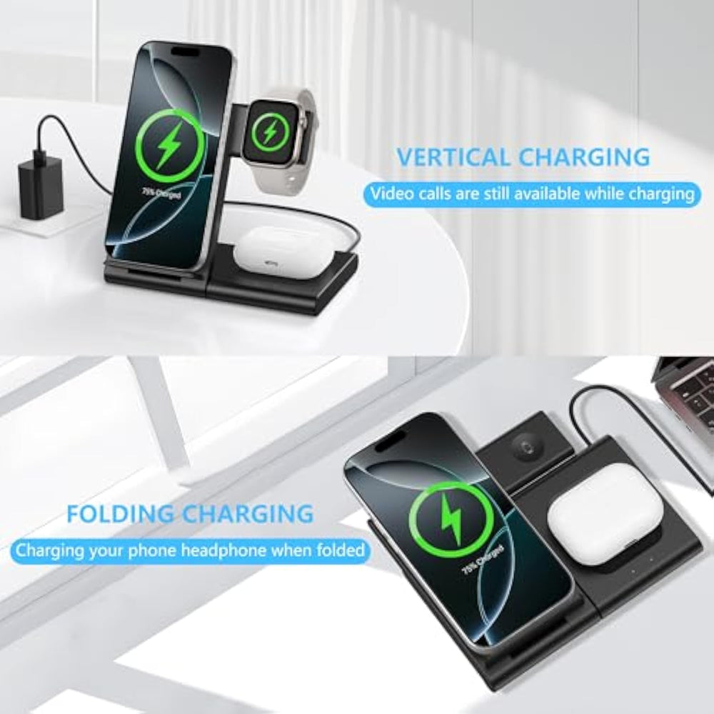 | Charging Station For Multiple Devices Apple: Power Up Your Iphone, Apple Watch, And Airpods At The Same Time With This 3 In 1 Charging Station Apple. Designed For Seamless Compatibility With Iphone 16/15/14/13/12/11 (Pro/Max/Plus), Apple Watch Ultra/10/9/8/7/6/5/Se, And Airpods 4/3/2/1/Pro, (Note: Incompatible Airpods 4 No Noise Reduction Version) | | Fast Safe Wireless Charging: Featuring 18W Fast Charging, This Charging Station For Apple Devices A Stable And Efficient Charge While Protecting Against Overvoltage, Overcurrent, Short-Circuit, And Temperature Fluctuations. The Fcc-Certified Multiprotect Safety System Ensures Worry-Free Charging | | Compact Travel Friendly Design: This Foldable Apple Charging Station Is Lightweight And Portable, Making It The Perfect Travel Charger For Home, Office, Or Vacations. Keep Your Workspace Tidy While Enjoying The Convenience Of Wireless Charging For Multiple Devices | | Standby Mode Versatile Functionality: Designed For Multi Angle Use, This Iphone And Watch Charging Station Can Be Used As A Phone Stand While Charging, Allowing For Hands-Free Viewing During Video