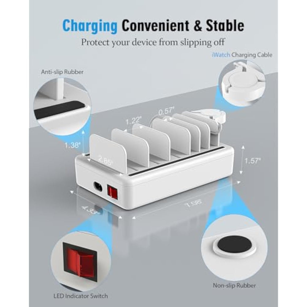 | ??Efficient And Versatile: Family Charging Station For Multiple Devices Apple Charges Up To 6 Different Devices At Once, Including Watch, Cellphones, Pads, Kindles, And More! Multiple Device Charger Station Comes With 1 Watch Charger(Only For Iwath), 3 Lightning Cables, 2 Type-C Cables, 1 Micro Usb Cable To Meet All Your Charging Needs. (6 Charging Cables 10.2 Inches) | | ?Rapid Secure Charging: Our Phone Charging Station For Multiple Devices Offers Rapid Charging With A 50W Adapter And Max 2.4A Output, Boosting Speed By 85% Compared To 2A Chargers. Multiple Charging Station For Apple Devices Is Crafted From Flame-Retardant Abs, It Ensures Durability And Safety. With Protection Against Over-Charging, Overheating, And Short-Circuits, Your Devices Charge Swiftly And Securely | | ??Robust And Reliable: Constructed From High-Quality And Timeproof Abs Material, Our Usb Tablet Charging Station For Multiple Devices Ensure Long-Lasting Reliability. The 0.13" Thick ?1.5" Height Baffle, And The Anti-Slip Rubber Surface Provides Enhanced Device Protection, Ensuring A Slip-Free And Stable Placement For Your Devices. Despite Its Sturdy Build, Charging Station For Multiple Devices Android Remains Lightweight And Easily Portable, Making It An Ideal Travel Companion | | ??Tidy Organized: The Charging Station Android Multiple Devices Enables You To Conveniently Charge Up To 6 Devices Simultaneously In A Single Location. This Multi Pad Docking Station Helps Declutter Your Desk By Keeping Cables Neatly Organized. Additionally, This Multiple Apple Device Charging Station Serves As A Handy Organizer For Electronic Devices, Preventing Them From Being Scattered Around | | ??Universal Compatibility: Our Multi Device Charging Station With Cables Is Compatible With A Wide Range Of Apple And Android Devices, Such As Smartphones, Tablets, Earbuds, Cameras, And Kindles. It Supports Various Usb Cables, Including Ap Usb, Micro-Usb, And Usb Type-C, Ensuring Seamless Charging For Your Devices. Charge Your Devices Hassle-Free | |