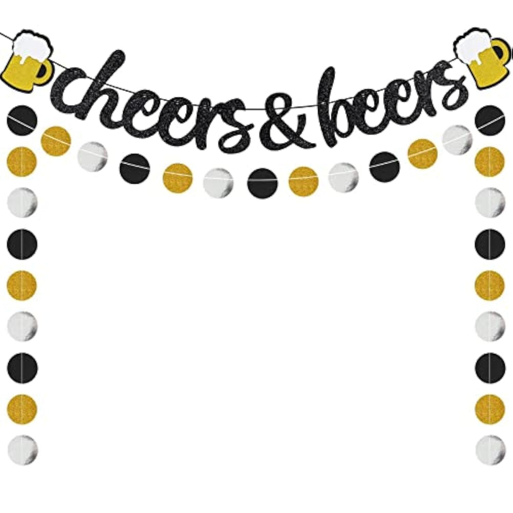 | No Assembly Required: Cheers Banner Decorations Will Comes Pre-Strung And Ready To Hand. | | Lots Of Use Occasions: Raise Your Glass To Celebrate The Happy Moment Together! Great Addition For Birthday,Wedding,Anniversary,Bachelorette,Graduation,Retirement,Bridal Shower,Engagement,Girls Night Out,Baby Shower,Gender Reveal,Parade,Indoor Or Outdoor Decor Or Any Themed Parties. | | Party Decoration: Suitable For Decorating From Branches, Ceilings, Or Opening Against A Wall, Hanging Up Dessert Tables, Backdrops Or Any Party Space. | | Package Including: Pre-Assembled Cheers Glitter Banner,Black Gold Silver Circle Dots Garland (57 Pcs Circle Dots).Each Glitter Paper Circle Dot Ornaments Diameter Is 2 Inches.You Can Make It Decorate Your Party By Your Like Way. | | Material: Cheers Banner Decoration Is Made Of Black And Gold Sparkle Card Stocks, Shiny And Anti-Bending, The Banner And Circle Dots Garland Have Been Assembled So That You Can Decorate With Ease. | |