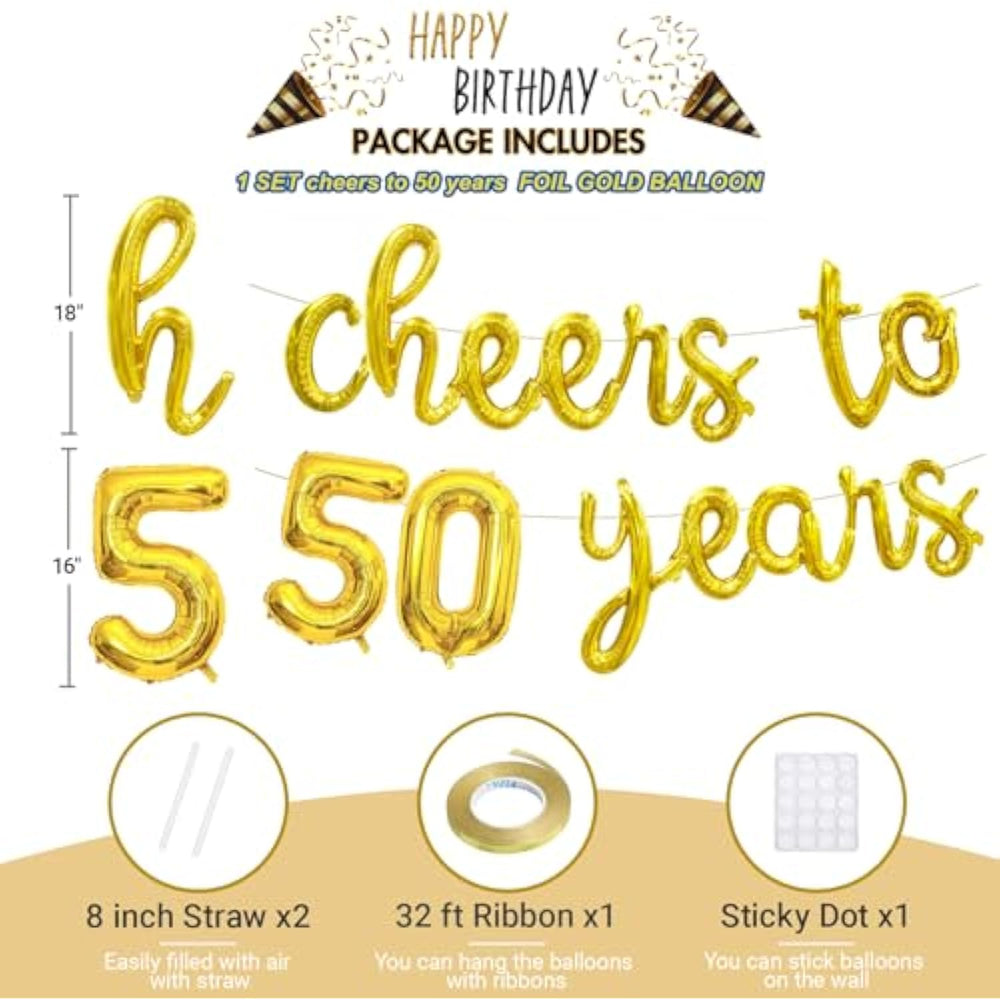 | ??Premium Grade 'A' Material?? This Cheers To 50 Years Banner For 50Th Birthday Decorations Is Crafted From 100% High-Quality Grade 'A' Foil Material, Our Happy 50Th Birthday Banner Balloons Exudes Durability And Texture And Long-Lasting Use For 50Th Birthday Or Anniversary Party Supplies. | | ?Easy Inflation And Setup? This 50Th Birthday Balloon Banner Features A Self-Sealing Valve, And It Is Designed To Withstand Inflation And Can Be Easily Filled With Air Or Helium With An Included Straw, Also Easy To Setup With Included Glue Dot And Ribbon, Making It A Breeze To Create A Stunning Display. | | ??Perfect Size??These 50Th Birthday Decor Includes 1 Set Of 16-Inch Gold Letter Foil Balloons That Spell Out "Cheers To Years", 1Pc 18-Inch Gold 50 Number Balloons And A Convenient Straw For Inflation. Also Includes Ribbon And Glue Dot For Easy Setup. | | ??Cheers To 50 Years?? Turning 50 Is A Monumental Moment--A Time To Reflect On The Past And Embrace The Future! Thirty Years Of Love--Commitment,And Shared Memories Deserve A Grand Celebration! Whether It’S An Intimate Family Gathering Or A Wild Celebration With Friends, This Balloon Will Be The Centerpiece Of Your Party, Making Your Party An Unforgettable Milestone. | | ??Versatile ??Our Cheers To 50 Years Balloons Are Suitable For Any Anniversary, Such As 50Th Birthday, 50 Years Wedding, Retirement Indoor And Outdoor Party Decoration. If You Receive The Product Damaged Or Unsatisfactory, Please Feel Free To