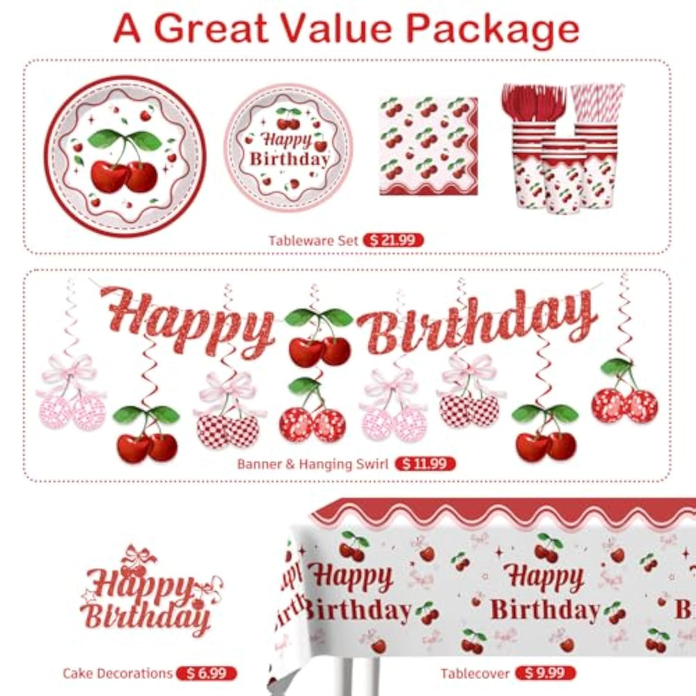 | Cherry Birthday Decorations Include: 1Pc Cake Topper, 20Pcs 7-Inch Cherry Plates, 20Pcs 9-Inch Cherry Plates, 20Pcs Paper Cups, 20Pcs Napkins, 20Pcs Forks, 20Pcs Paper Straws, 2Pcs 70.8*42.5-Inch Tablecloth, 1Pc Welcome Baby Boy Banner, 8 Hanging Swirls, A Total Of 132 Pieces Cherry Birthday Party Style Designs | | Materials: Cherry Plates And Napkins, As Well As Straws Made From Food-Grade Paper. The Cherry Paper Plates Are Made Of Durable, Thick 300 Gsm Paper, Which Will Be Sturdy Enough To Hold Drinks And Food. There Is No Need To Worry About The Tears And Flimsy Folds | | Unique Design: The Cherry Happy Birthday Banner And Hanging Swirls Are A Fun Way To Add A Little Extra Pop To The Wall Or Cake Table. The Cherry Plates And Napkins Are Printed With Adorable Cherries And Bows. When Your Guests See These Cherry Plates And Napkins Party Supplies, They Will Be Deeply Attracted And Praise The Cherry Birthday Decorations | | Quick And Easy Clean Up: The Cherry Themed Party Decorations Set Is Complete And Includes Everything You Need For Your Cherry Birthday Party. Disposable Tableware Set Makes The Clean-Up After A Party So Much Easier. Simply Dispose Of Them After Use, Saving More Time To Enjoy Your Party | |