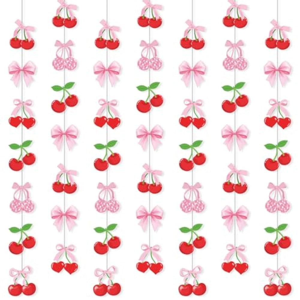 | Cherry Party Decorations: Still Wondering How To Decorate Your Cherry On Top Theme Party 8 Pieces Of Cherry Bow Theme Banners Are Definitely Your Best Choice; The Pink And Red Color Combination Is More Lively And Fresh, And Will Become The Highlight Of Your Party | | Cherry Bow Theme Design: This Cherry Party Hanging Decorations Combines Lovely Cherry And Sweet Bow Elements, With A Delicate Pastel Palette To Create A Dreamy And Elegant Atmosphere, Meeting All Your Party Decoration Needs And Making Your Party Scene More Attractive | | Sturdy And Durable: Our Cherry Garland Banner Crafted From Durable Paper Card, Sturdy And Reusable, Are Designed To Hold Up Throughout The Celebration; Different Shapes Of Cutout Printed With Bow And Cherry Pattern, Clear Printing With Exquisite Detail, Cute And Fun | | Easy To Use: This Paper Party Decoration Is Pre-Assembled, No More Diy And The Rope Is Not Easy To Tie Together, Easily Decorate Your Party; You Can Hang The Bow Garland Banner At The Wall, Door, Window, Under The Ceiling, Fireplace, Patio And Gazebo, Bringing Your Friends And Family An Impressive She'S The Cherry On Top Theme Party | | Wide Occasion: The Pink Coquette Party Decor Are Nice For Decorating Girls Bow Birthday Party, Summer Cherry Party, Baby Shower, Bachelor Party, Wedding, Classy Or Playful Birthday Etc, Which Sure To Bring A Touch Of Sweetness To Any Party Scene And Help You Complete A Cute Party Time | |