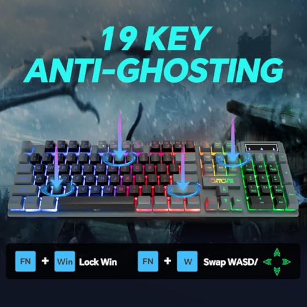 | ?Full Size Keyboard, Plug and Play with It?104 Keys Full Size Keyboard. Featuring standard keyboard layout with F-keys ( function keys ) and number pad. Floating keycaps are removable and feel good in the hand. The wired keyboard brings you efficient typing while at work or gaming. Plug and play with it, no other driver or software needed. | | ?Wired Gaming Keyboard?Wired keyboard and mouse with RGB backlight, there are 3 kinds of brightness can be adjusted, the backlight can be switched to breathing mode, breathing rate fast or slow can also be adjusted, the light up keyboard allows you to play or work normally in the dark. | | ?Finer-resolution Mouse?4 adjustable DPI (800/1600/2400/3600). High speed transmission technology makes it move faster and more accurate. 4 levels of DPI meet the needs of different scenarios. 10G ACC super-fast game engine 6 Buttons Gaming Mouse, when you are playing games, the mouse can be moved quickly and accurately. | | ?Multi-Media Anti Ghosting?12 multimedia keys for your gaming operation or work efficiency. 19 anti-ghosting keys, every click is never lost, ensuring smooth typing. You can interchange WSAD keys with arrow keys,with a lock/unlock WIN key, the game experience will be smoother. (Note: Multimedia keys are unavailable on Mac) | | ?Wide Compatibility Outstanding ?The Computer keyboardmouse combo compatible with Windows 2000/2003 / XP / Vista / Win7 / Win8 / Win10. Works perfectly for PC ,Computer ,Laptop ,PS4 ,X box ,Mac.If you encounter any situation while using, ???? ?????????????? ?? ??????% ???????????? ???? ??????????????????????. Please get in touch with us, and our service team will provide you with a satisfactory response within 12 hours. | |