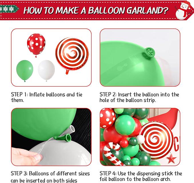 This Christmas balloon garland kit includes a festive selection of red, white, light green, and retro dark green balloons in multiple sizes, along with candy cane balloons, Christmas candy balloons, and a Santa Claus foil balloon. The set also comes with a balloon strip and adhesive dots for easy setup. Made from premium-quality latex and foil materials, the balloons are durable, safe, and resistant to bursting, suitable for inflation with air or helium. Simple to assemble in just minutes, this kit allows you to create a beautiful balloon arch that enhances the holiday spirit. Perfect for Christmas parties, New Year celebrations, company gatherings, and festive birthdays, it adds a cheerful and elegant touch to any seasonal event.