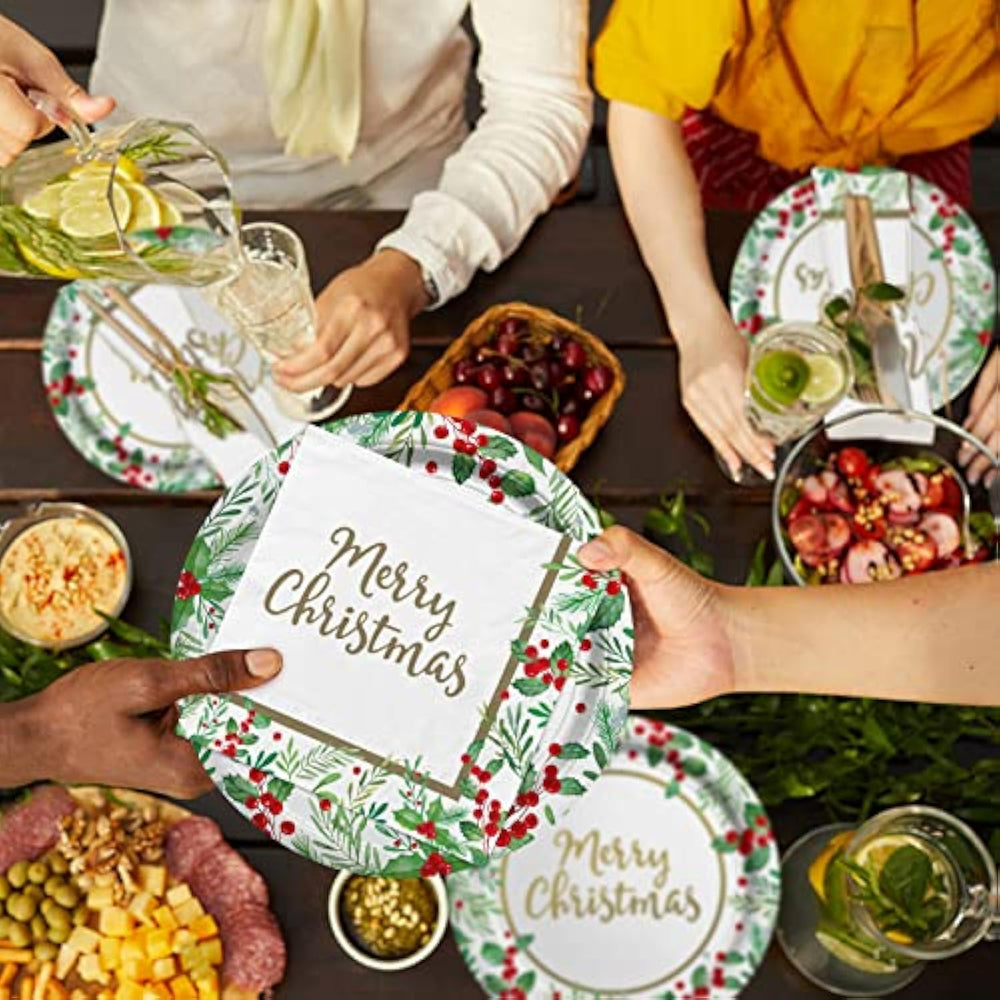 | Christmas Holly Package Includes: 50 Pcs 9 Inch Paper Dinner Plate, 50 Pcs 7 Inch Paper Dessert Plates, And 50 Pcs Seasonal Holly Paper Luncheon Napkins (3Ply, 6.5”X 6.5”Folded), 50 Pcs Beverage Napkins (3Ply, 5”X5” Folded). | | Christmas Day Is A Holy Day! Be Cheerful, Be Festive! This Christmas Party Pack Was Designed With Green And Red Traditional Holly. The Dinner Plates And Napkins Feature A Golden "Merry Christmas" Headline. Mix And Match Our Seasonal Holly Collections To Create A Festive Seasonal. | | Eco-Friendly Durable Partyware?Those Disposable Paper Plates, Napkins Are All Printed With Food Grade Water-Based Inks, Suitable For Food