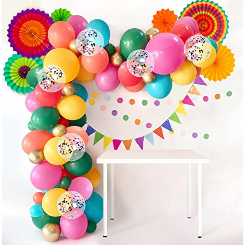 This fiesta balloon garland kit includes 80 colorful latex balloons in various sizes (5" to 12") in green, blue, yellow, pink, gold, red, coral red, and faint yellow with confetti, along with six fiesta paper fans (7.3” to 15.4”), a 16.4ft balloon arch strip, a blue balloon tying tool, and a roll of sticky dots. To create a balloon arch, inflate balloons, knot them, insert them into the strip, and attach extras with sticky dots for a fuller look. The pre-folded paper fans can be easily assembled using self-sealing stickers or paper clips to enhance your Mexican fiesta party decor.