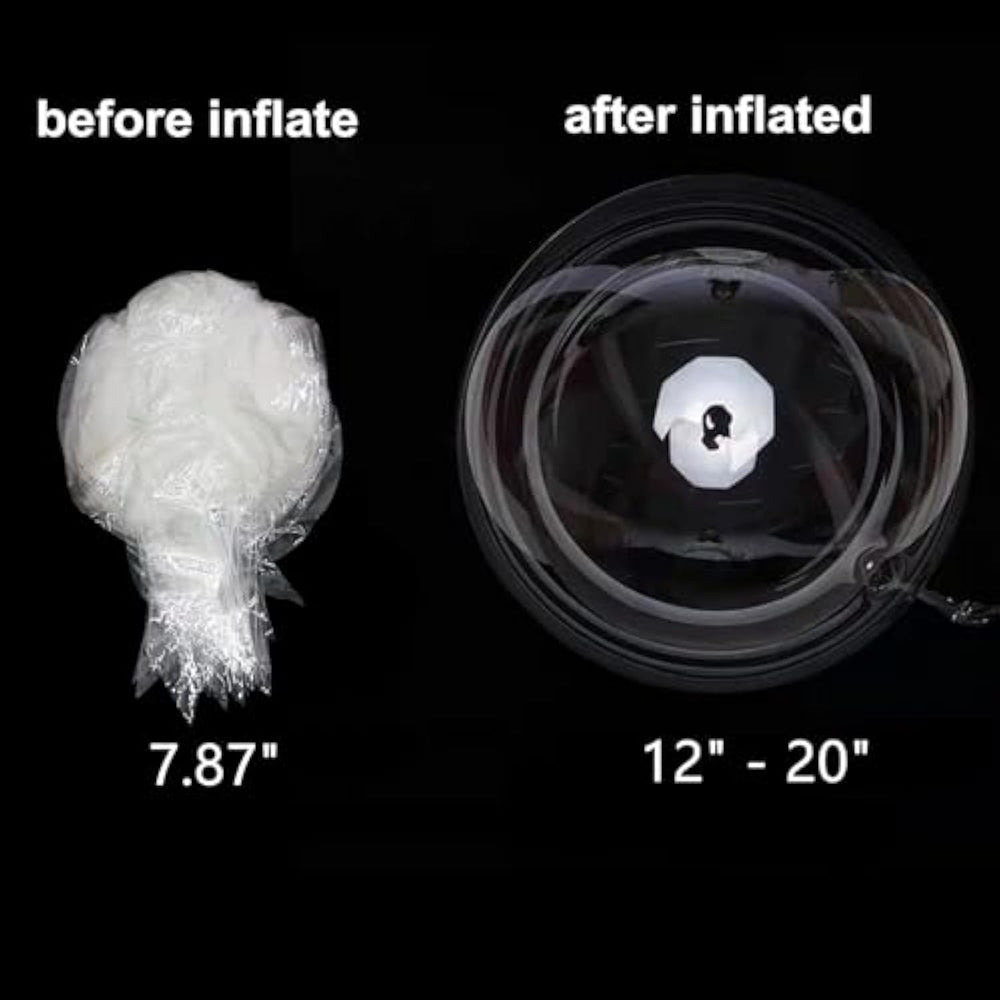 | Pack Include : 15 Pieces Pre Stretched Version Clear Bobo Balloons (Small Things , Such As Confetti, Small Balloons ,Feathers Can Stuff Inside Without Expand Machine ) | | If The Middle Line Of The First Balloon Is Not In The Middle After Inflation, Please Deflate The Balloons And Stretch It More Manually, Then Inflate The Balloon Again , You Can Stretch The Rest Balloons More Before Inflation To Get The Best Performance . | | Size Inflation : These Bubble Balloons Are About 7.8 Inch Before Inflation , Suggested Inflate Size 14-20Inch . We Can Inflate With Air Pump, Only Helium To Make It Float Up . | | Material : This Round Clear Balloons Are Made Of Pvc, A Kind Of Durable Plastic, High Quality, Non-Toxic, High-Elastic And Environment Friendly | | Widely Application?Outdoor Or Indoor, In The Daytime Or Evening, It Is A Transparent Bubble Balloon, Can Be Used In Any Event And Balloon Arch Chains, Such As Birthday Party , Baby Shower Decoration, Wedding Decor , Bubble Decoration | |