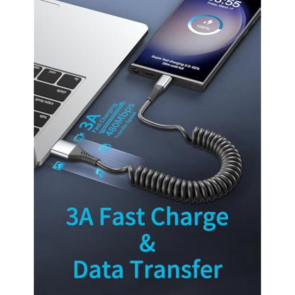 | Fast Charging: The Coiled Usb C Charger Cable Supports 3A Fast Charging For Quick Power-Ups. The Coiled Usb Totype C Cable Enables Data Transfer At Up To 480Mbps, Ideal For Moving Large Files. | | Flexible Length: Usb C Retractable Cable Is 1 Foot Long When Retracted, Making It Highly Portable. The Coiled Type C Cable Stretch From 1.5 To 2.3 Feet (Up To 3 Feet Max), Offering Versatile Lengths For Easy Use. | | Durable Design: With A Strain Relief Boot And Aluminum Alloy Shell, The 3Ft Usb Type C Cable Offers Excellent Heat Dissipation And Durability, This Coiled Usb C Car Cable Can Bear 25000+ Bending Test. | | Wide Compatibility: This Coiled 3Ft Usb To Usb C Cord Compatible With Android Auto, Apple Carplay, Iphone 16 15 Pro/Plus/Pro Max, Chromebook, Moto Z8, Galaxy S23 Ultra, Google Pixel 3, Huawei P30 Pro, And Other Usb-C Devices. | | What You Get: 2 Pack Coiled Usb A To Usb C Cable, With Our 12-Month Product Replacement , If You Have Any Questions, We Will Resolve Your Issue Within 24 Hours. | |