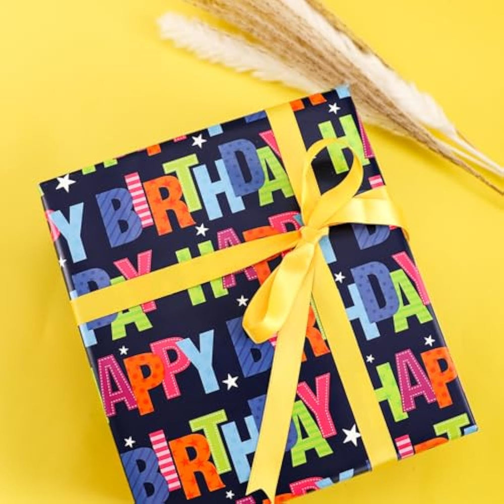 This vibrant birthday wrapping paper features colorful “Happy Birthday” lettering that brings joyful energy and heartfelt wishes to any birthday celebration. With fun patterns and cheerful colors, it’s sure to make gift-giving extra special. Each roll measures 17 inches wide by 32.8 feet long, providing 46.5 square feet of paper—perfect for wrapping small to medium gifts. Made from thick, high-quality paper, it’s durable and tear-resistant, with a smooth, glossy finish protected by shrink film to prevent scratches and reduce dust for a polished look.