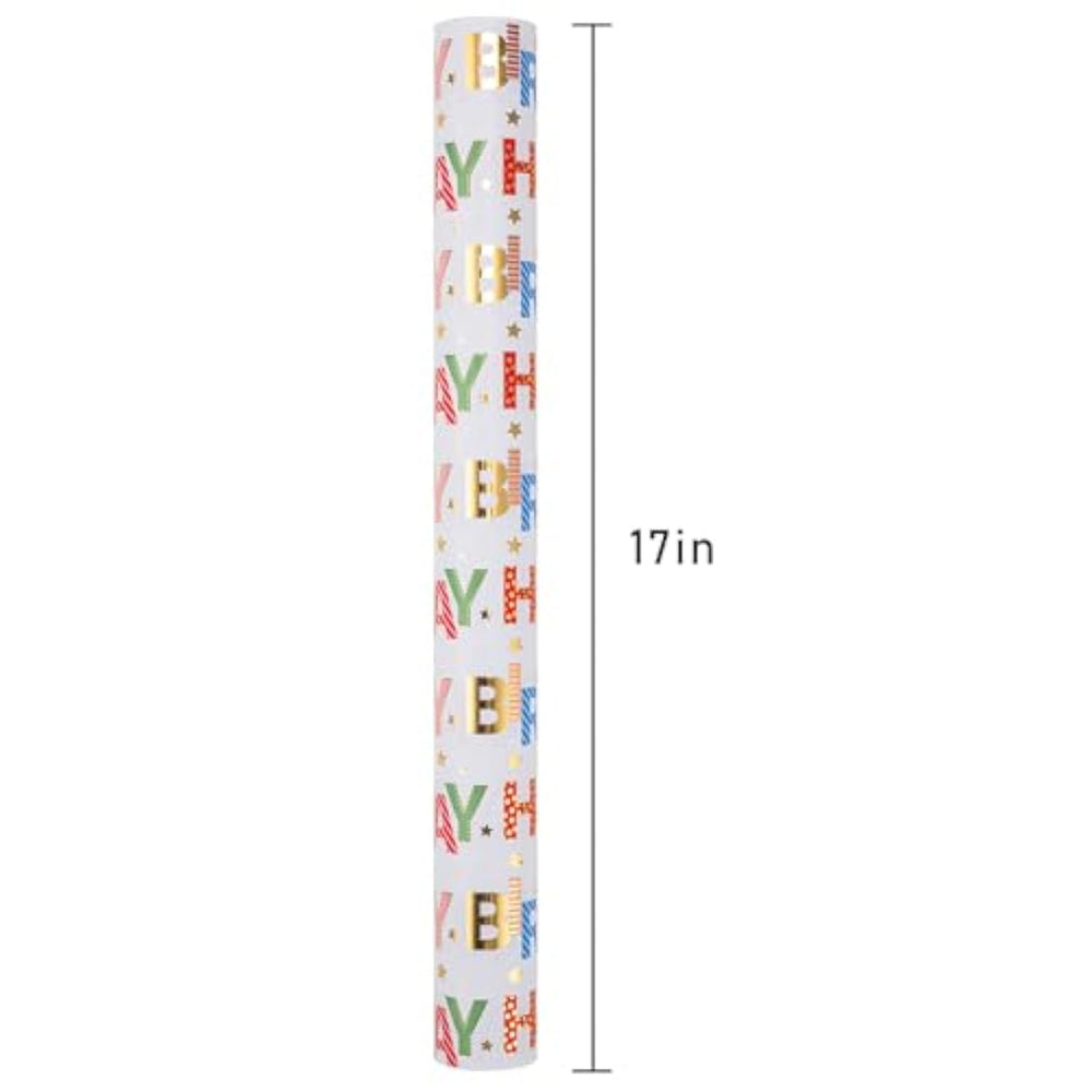 This birthday wrapping paper features colorful foil letters spelling HAPPY BIRTHDAY along with festive candles and stars, creating a vibrant and eye-catching look that adds a special touch to birthday gifts, baby showers, and party celebrations. Each roll measures 17 inches wide by 32.8 feet long, providing 46.5 square feet of paper—ideal for wrapping small to medium-sized gifts like shirt boxes or cubes. Made from high-quality paper with a good thickness, it resists tearing and features bright, fade-resistant printing for a polished and cheerful presentation.