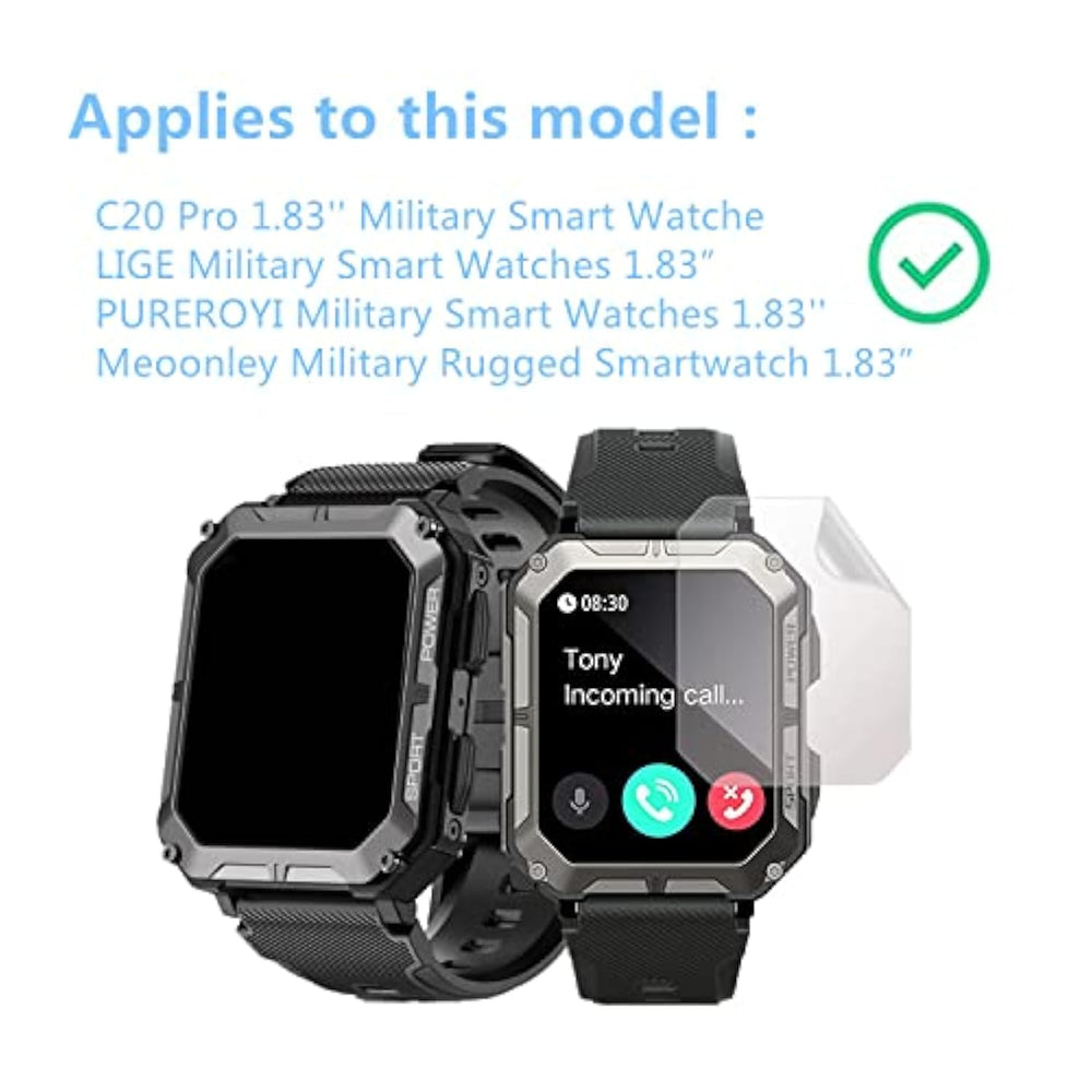 | Compatibility?Include 6 Pack Pet Screen Protector?Compatible For Pureroyi 1.83'' C20 Pro Military Smart Watches/ Meoonley Military Smartwatch 1.83''/ Viran Military Smart Watch/ Rgthuhu Military Smart Watch/ Lige Military Smart Watches 1.83''/ Tensky C20 Pro 1.83" Military Smart Watch/ C20 Pro 1.83" Military Smart Watches?Please Check Your Watch Model Before Purchg | | Material?Made From The High Quality Pet Film?Oleophobic Coating Technology Treatment?Surface Smooth | | Hd?Clear Resolution Which Keeps The Bright And Colorful Image Quality | | Easy To Install?Adopt A Typical "Static Cling" Pet Screen Protector?Package Comes With Installation Tools, Please Read The Steps Of The Instruction Manual To Install | | Service: We Provide You With Professional