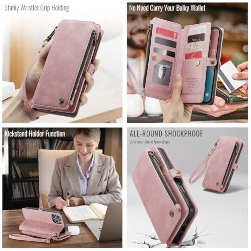 | 1.?Compatible Model?: Elegant Soft Pu Leather Case Compatible With [Apple Iphone 13 Pro Max - 6.7"] | | 2.?Premium Fashion?: Wallet Made With Top Quality Soft Pu Leather, Durable And Fine Sewing; Inner Phone Case Made With Flexible Tpu,Easy To Install Take Off Without Scratching Your Pricly Cell Phone. The Shell Glued To The Wallet Stably,Will Not Drop Off From The Wallet | | 3.?All-In-One Wallet Design?: Multifunctional Zipper Pocket Pouch + Phone Case In One With Rfid Blocking Function. With Magnetic Mini Buttons Snap Flip Closure, Include Card Holder Zipper Pocket Phone Shell Part,All-In-One Design Allows You Carry This Case Go Outside Without Carrying Your Bulky Wallet,Suitable For Women Men | | 4.?Rfid Blocking Card Slots Zipper Wristlet?: Includes Rfid Blocking 10 Card Holder + 1 Zipper Bag + 1 Cash Slots,Hold Your Id,Credit Cards,Driver License,Bills,Coins And A Little Bit Cash Without Problems. The Zipper Has Been Tested More Than 5000 Times; With A Removable Wrist Strap, Providing A Optional Griping Method | | 5.?Kickstand Function Full Body Protection?: With Built-In Kickstand, Convenient For Watching Movie Or Chatting Video; The Full Body Protection Design Providing A Nice Protection For Your Phone. | |