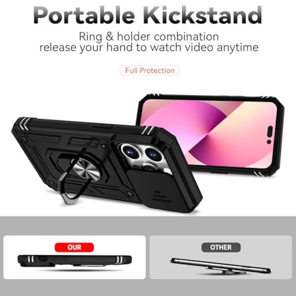 | ?Compatible With Iphone 14 Pro?Note ??Not For Iphone 14 Or Iphone 14 Plus Or Iphone 14 Pro Max?.Package Includes Hd Screen Protector And Install Them According To The Instructions.?Note That?Wireless Charging Is Not Supported! | | ?Camera Lens Protection? This Phone Case Use Lens Slide Design, It Easy To Slide And Not To Loose, And Enhance Protective Of Your Phone Camera From Scratches, Collision, Scuffs And Impact, Not Only Improve Safety, Protect Your Privacy But Also Has A Sense Of Fashion. | | ?360° Rotable Magnetic Kickstand? Advanced Ring Metal Kickstand Can Rotate 360°, Easy To Rotate And Sturdy On The Phone Case. Built In Kickstand Gives You The Convenience To Watch Videos And Movies Hands-Free With Desired Comfort And Stability. | | ?Full Body Protection?This Phone Case Is Made Of Anti-Scratch Hard Rigid Pc Bumper And Shock Resistance Soft Tpu, With Air-Cushion Technology For All Corners And The Raised Tpu Bezel Design, Provide All Around Double Protection Of Your Phone From Drops, Scratches And Bumps. | | ?High Quality After Sales Service? Provides 90 Days . If There Is Any Problem With Your Product, Please Feel Free To