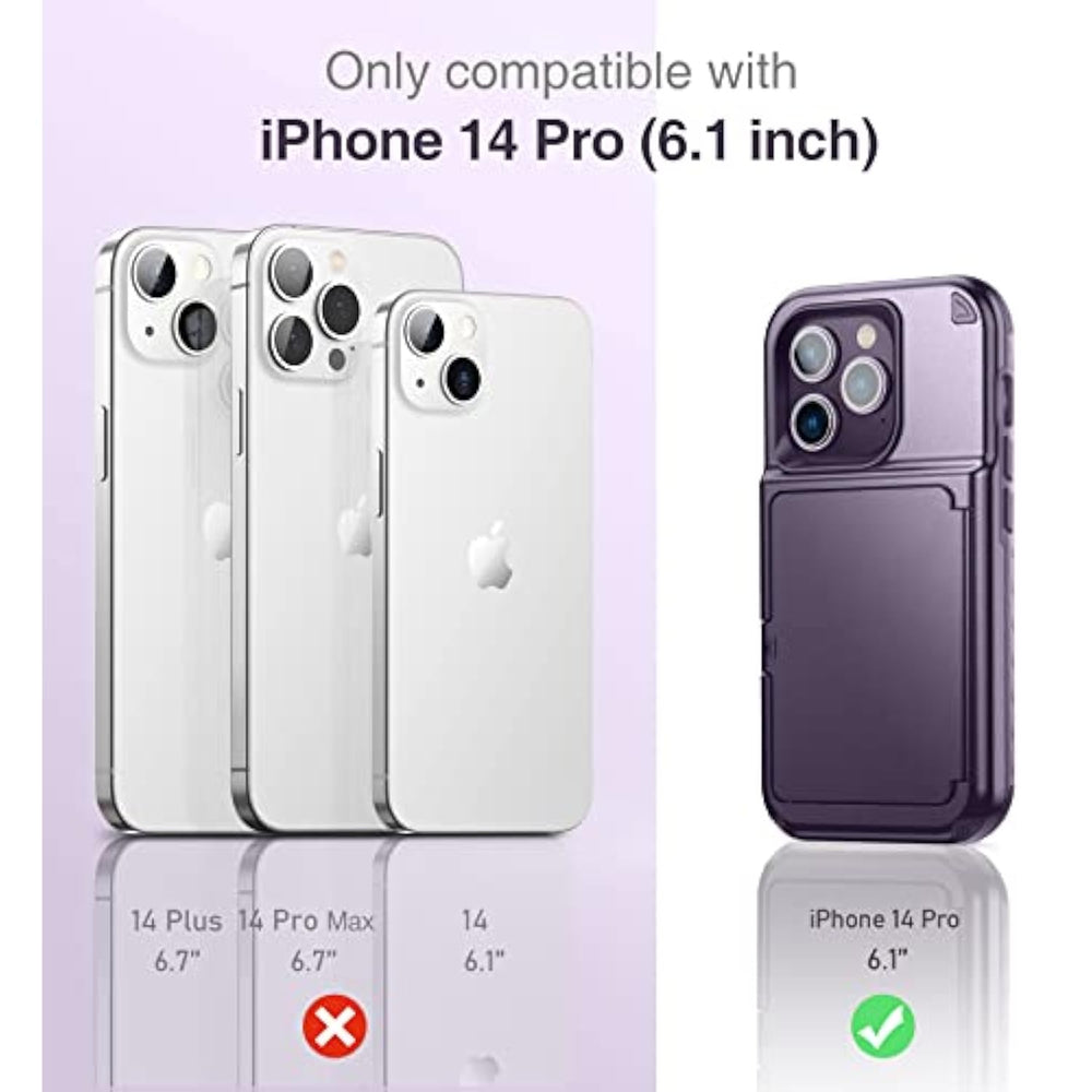 | ?For Apple Iphone 14 Pro Wallet Case?New Wallet Design Only Compatible With Apple Iphone 14 Pro 6.1 Inch, Defender Wallet Case Be Made Of High-Quality Shockproof Tpu And Hard Pc Materials Securely 360 Degree Protects Apple Iphone 14 Pro. | | ?For Iphone 14 Pro Case With Card Holder?Hidden Wallet Compartment Securely Stores Up To 2 Cards Yet Adds Minimum Bulk To Your Phone, Hidden Mirror Inside Is Designed Especially For Your Daily Makeup. | | ?Advanced Three Layer Overall Protection?3 In 1 Hybrid Shockproof Scratch-Resistant Front Pc Defender, Soft Tpu Rubber Bumper And Impact-Resistant Hard Pc Cover, And Anti-Drop Pattern At The Back Of The Fuselage, Full-Body Protects Your Phone From Shock, Drops, And Scratches. | | ?For Iphone 14 Pro Case Raised Edges? Responsive Control Buttons Precise Cut Holes For The Mute Buttons, Speakers, Charging Port, And Camera. Features Raised Lip Provides Added Protection For Screen And Camera. | | ?For Iphone 14 Pro Case Stand Feature? The Compartment Flip Is Also Constructed To Function As A Kickstand By Locking Itself Within 100°, Convenient For Movie-Watching Or Video-Chatting. | |