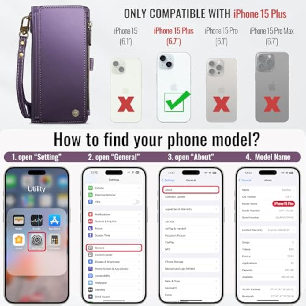 | 1.?Compatible Model?: Elegant Soft Pu Leather Case Only Compatible With Iphone 15 Plus [6.7 Inches]; Not Fit For Iphone 15/ 15 Pro/ 15 Pro Max. Please Follow These Steps To Check Your Phone Model: Open Settings ≫ General ≫ About ≫ Model Name. | | 2.?Premium Fashion?: Wallet Made With Top Quality Soft Pu Leather, Durable And Fine Sewing; Inner Phone Case Made With Flexible Tpu,Easy To Install Take Off Without Scratching Your Pricly Cell Phone. The Shell Glued To The Wallet Stably,Will Not Drop Off From The Wallet | | 3.?All-In-One Wallet Design?: Multifunctional Zipper Pocket Pouch + Phone Case In One With Rfid Blocking Function. With Magnetic Mini Buttons Snap Flip Closure, Include Card Holder Zipper Pocket Phone Shell Part,All-In-One Design Allows You Carry This Case Go Outside Without Carrying Your Bulky Wallet,Suitable For Women Men | | 4.?Rfid Blocking Card Slots Zipper Wristlet?: Includes Rfid Blocking 10 Card Holder + 1 Zipper Bag + 1 Cash Slots,Hold Your Id,Credit Cards,Driver License,Bills,Coins And A Little Bit Cash Without Problems. The Zipper Has Been Tested More Than 5000 Times; With A Removable Wrist Strap, Providing A Optional Griping Method | | 5.?Kickstand Function Full Body Protection?: With Built-In Kickstand, Convenient For Watching Movie Or Chatting Video; The Full Body Protection Design Providing A Nice Protection For Your Phone. | |