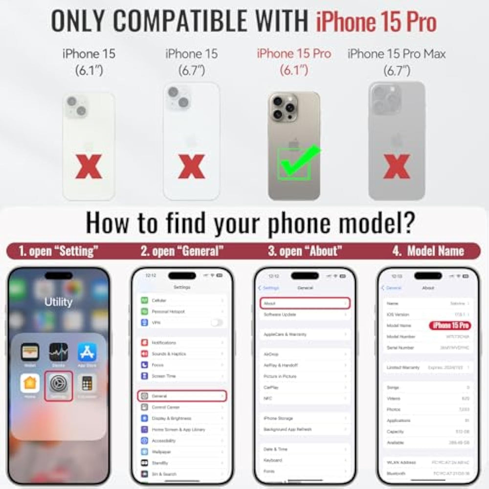 | 1.?Compatible Model?: Elegant Soft Pu Leather Case Only Compatible With Iphone 15 Pro [6.1 Inches]; Not Fit For Iphone 15/ 15 Plus/ 15 Pro Max. Please Follow These Steps To Check Your Phone Model: Open Settings ≫ General ≫ About ≫ Model Name. | | 2.?Premium Fashion?: Wallet Made With Top Quality Soft Pu Leather, Durable And Fine Sewing; Inner Phone Case Made With Flexible Tpu,Easy To Install Take Off Without Scratching Your Pricly Cell Phone. The Shell Glued To The Wallet Stably,Will Not Drop Off From The Wallet | | 3.?All-In-One Wallet Design?: Multifunctional Zipper Pocket Pouch + Phone Case In One With Rfid Blocking Function. With Magnetic Mini Buttons Snap Flip Closure, Include Card Holder Zipper Pocket Phone Shell Part,All-In-One Design Allows You Carry This Case Go Outside Without Carrying Your Bulky Wallet,Suitable For Women Men | | 4.?Rfid Blocking Card Slots Zipper Wristlet?: Includes Rfid Blocking 7 Card Holder + 1 Zipper Bag + 1 Cash Slots,Hold Your Id,Credit Cards,Driver License,Bills,Coins And A Little Bit Cash Without Problems. The Zipper Has Been Tested More Than 5000 Times; With A Removable Wrist Strap, Providing A Optional Griping Method | | 5.?Kickstand Function Full Body Protection?: With Built-In Kickstand, Convenient For Watching Movie Or Chatting Video; The Full Body Protection Design Providing A Nice Protection For Your Phone. | |