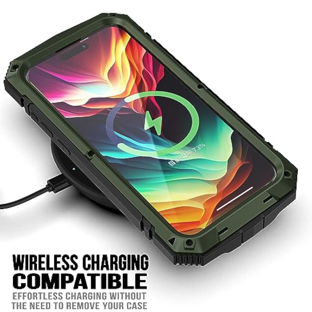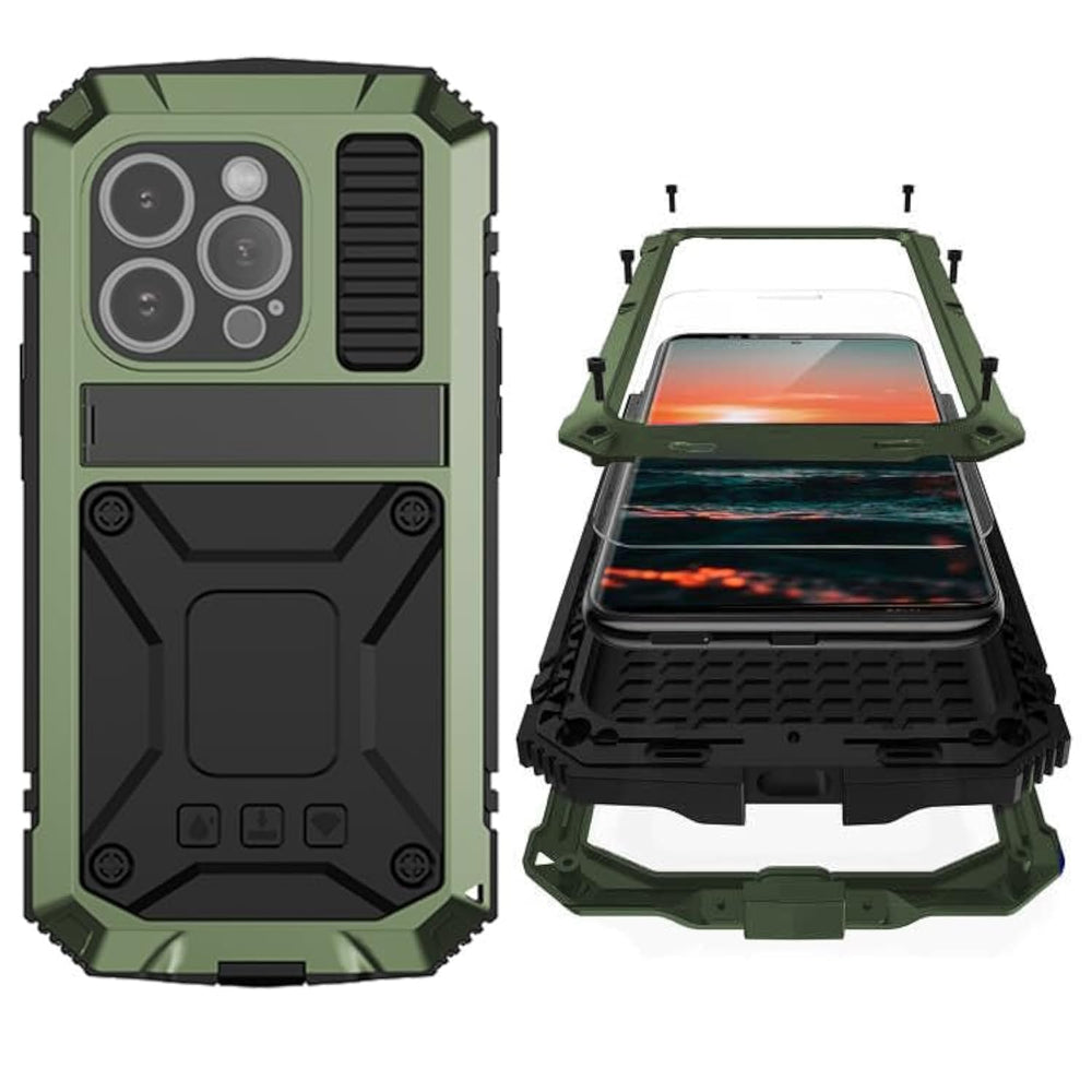 | 1. Compatible With:Iphone 15 Pro Max Release 2023 Only, Rugged Heavy Duty Water Resistant Dustproof Shockproof Aluminium Metal Case Designed For Man, Soldier, Warrior, Outdoor Enthusiasts, Rider, Truck Driver And Workers On The Ourdoor. | | 2.?360 Degree Full-Body Heavy Duty Protect Case? 3-Piece High-Quality Build Premium Materials Heavy Duty Construction With Built-In Front Glass Provides Accidental Drops, Shocks And Bumps.The Product Weighs Up To 250G,It Isn'T A Convenient Case Suitable For Daily Life,But When It Comes To Ultimate Drop Protection, This Cell Phone Case Is About As Comprehensive As It Gets. | | 3.?Shock-Absorbing Tpu Layer Solid Metal Frame Built-In Gorilla Glass Stand Kickstand?Protective Effects Of Protruding Hyper-Elastic Silicon Sandwiches And Metal Frame With Screws Fixed Offer Up To 6 Feet Drop Protection. Built In Kickstand Holds Your Phone At Optimal Viewing Angles For Movies Videos. | | 4.?Impact Resistant Case With Screen Protector?Built-In Thickened Gorilla Tempered Glass, Designed To Protect Your Screen From Scratches And Cracks. Added Camera Protection To Keep Dust And Dirt Out For True Full Body Protection! The Case Is An Ideal Protective Case For The Phone Users Who Work In The Construction Sector Workers On The Field Or Outdoor And The Parents Who Have Kids Around. | | 5.?Mil-Grade Certified With Air Cushion Technology?Armor Frame+Shock-Resistant Core+Impact-Resistant Rubber Surround+Built-In Screen Protector And Lens Protector,All Of This Means That You Have A Case That Offers Up To 8-Feet Of Drop Protection, Which Is Which Is Reach Military Grade Drop Protector. Military Grade High Impact Shock Absorption When Unexpected Falls. | |