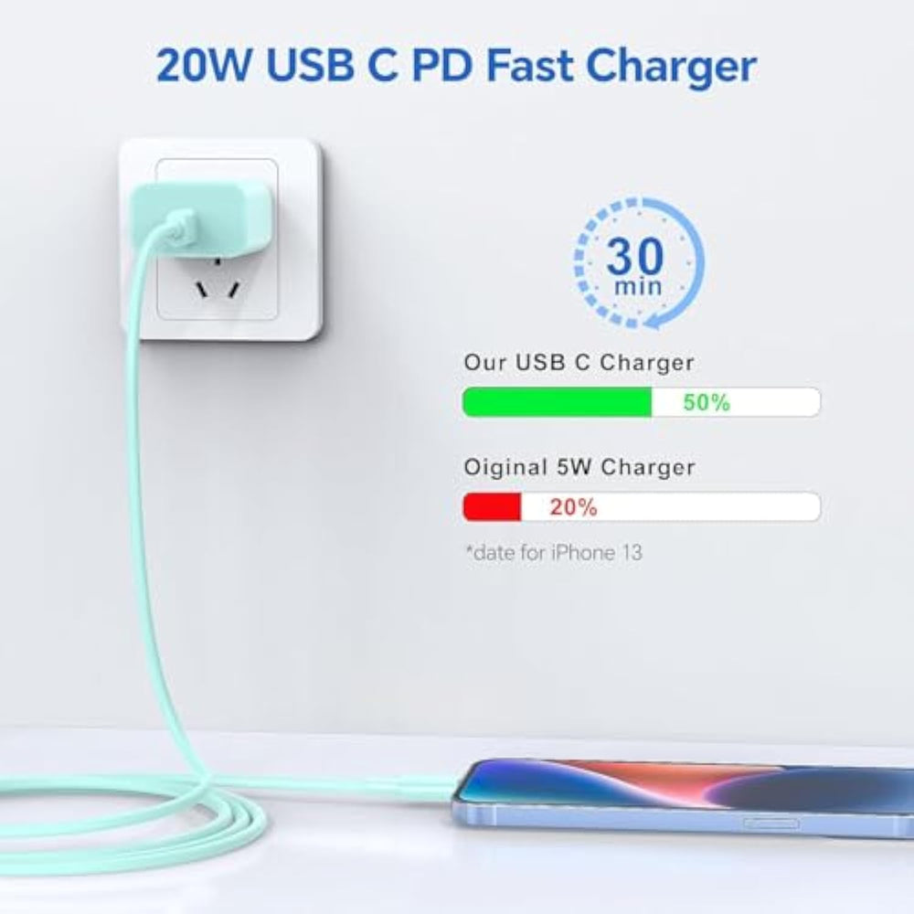 | ?3.0 Fast Charger?:3.0 Pd Purple/Blue/Red 20W Fast Charger With Usb C To Ightning Cable Charges Your Device Three Times Faster Than Original 5W Charger, Charging Your Phone 14 To 50% In Just 30 Minutes. | | ?Safety Efficient Fast Charging?:For Phone 12 13 14 Fast Charger Usb-C Wall Charger Has Built-In Multiple Protection Systems, Which Can Effectively Avoid Overheating, Overcharging, Over-Voltage And Other Phenomena, So As To Safely, Stably And Efficiently Charge Your Device.This 10Ft Long Usb C To Ightning Cable Is Made Of High Quality Material, Which Allows You To Use It Safely In Different Scenarios, Such As In The Car,On The Sofa, In Bed, Etc,So That You Can Enjoy The Charging Experience Anytime And Anywhere. | | ?Certified Ightning Cable?:Each Usb C To Ightning Fast Charging Cord Chiiip Is Officially