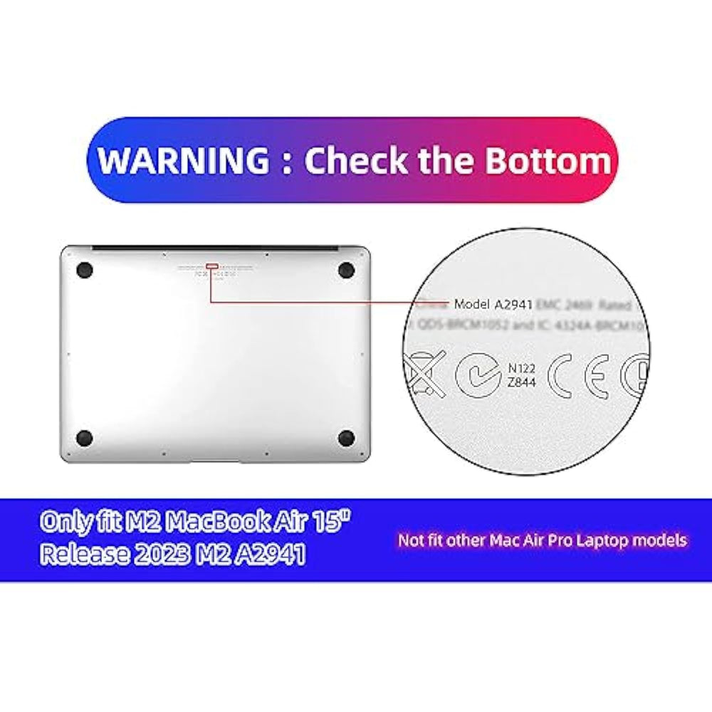 | ?Compatible Models?Only Compatible With Macbook Air 15/15.3 Inch 2023 Release A2941(With M2 Chip Liquid Retina Display Touch Id).Not Compatible With Macbook Air 13 /Macbook Pro 13/Pro14/Pro 15/Pro 16 Or Other Models. | | ?Friendly Reminder ?Before Your Purchase Please Kindly Check The Model Number "Axxxx" On The Back Of The Laptop . Make Sure You Choose The Exact Same Model Number As The Listing Title Stated "A2941" | | ?Stylish Durable ?Slim, Pretty, Stylish, Practical And Durable. The Protective Case Is Made Of High-Quality Plastic,Non Slippery Texture,Does Not Show Finger Prints?Perfect Fit, Make Your Mac Laptop Look Like New.Four Rubber Feet Can Hold The Device Firmly In Place.Also Prevent Wear On The Bottom Of The Mac Air 15 Case. | | ?Easy Installation Removal ?All Buttons And Functions Can Be Used. Snap Design, Easy To Install And Remove. All Ports Can Be Accessed Without Removing The Casing.Perfectly Matched Ventilation Holes On The Bottom Case Keep The Laptop Cool. | | ?Our Service?If You Are Not Satisfied With Our Products, Or Buy The Wrong Model,Please