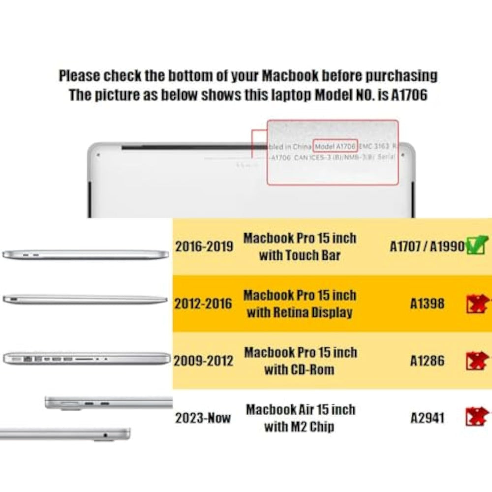 | ?Only Compatible With??Macbook Pro 15 Inch With Touch Bar Model A1707/A1990 (2016-2019 Released); Please Double Check Your Macbook'S Model Number "A1Xxx" On The Bottom Of The Laptop To Determine The Compatibility | | ?Not Fit??Macbook Air 15 Inch Model A2941 (2023-Now Released), Nor Macbook Pro 15 Inch Retina Display Model A1398 (2012-2016 Released),Nor Macbook Pro 15 Inch With Cd-Rom Model A1286 (2009-2012 Released). If You Look For Other Model Case,Please Click "Visit The Store" Below The Title. | | ?High-Quality??Premium Quality Matte Finish Hard Plastic Case? Make Your Macbook Against Shock, Scratch, Dusty And Other Damage?Precise Construction And Cut Out Allows Complete Access To All Ports, Features, Buttons | | ?Good Heat Dissipation??Bottom Is Vented For Safe Heat Disbursement. Non-Slip Rubberized Feet At The Corners Of The Bottom Keep Adequate Space For Ventilation And Keep Your Macbook Firmly In Place | | ?Packing Including ??Hard Shell Case For Macbook Silicone Keyboard Cover Skin Screen Protector Sleeve Bag Dust Plugs | |