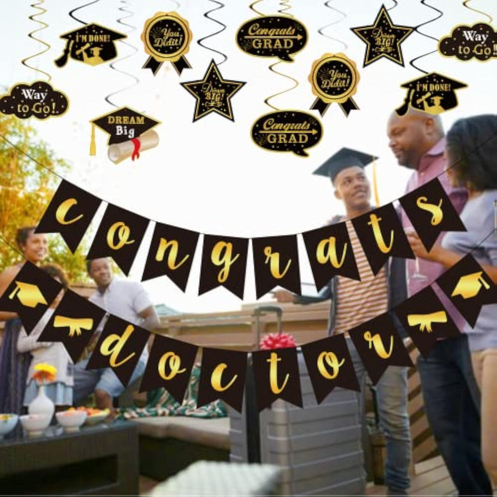 | ????? ??????What You Will Get?:1 Set Black Gold Glitter Congrats Doctor Banner,6Pcs Different Congrats Streamers Congrats Swirl And 6Pcs Slivergoldblack Swirl.Supply A Lovely Grad Theme Party,Perfect Graduation Party Decorations,Doctor Party Decorations! | | ?????Unique Design?:Independent Design, In Order To Bring You Better Product Quality, We Have Upgraded And Adjusted Our Products. Medical Party Supplies,Congratulations On Graduation Decoration, Doctoral Graduation Ceemony, Doctoral Party Decoration, Medical Staff Retirement Blessing Banner, Medical School Graduation Banner! | | ????? ??????Steps For Usage?:The Banner Needs To Be Assembled By Yourself, Just Take 1 Or 2 Mins String Up! You Can Directly Hang The "Congrats Doctor" Banner On The Dessert Table In The Room, The Courtyard Fence Or The Tree. On Graduation Day, This Will Be A Surprising Party Decoration. | | ???????????High Quality Materials?: "Congrats Doctor" Banner Is Made Of Safe And Reliable Gold Cardboard, Specially Designed For Medical Graduates. The Banner Reminds You Of Your Past Study Time, Which Will Make You Look At Life More Enthusiasti