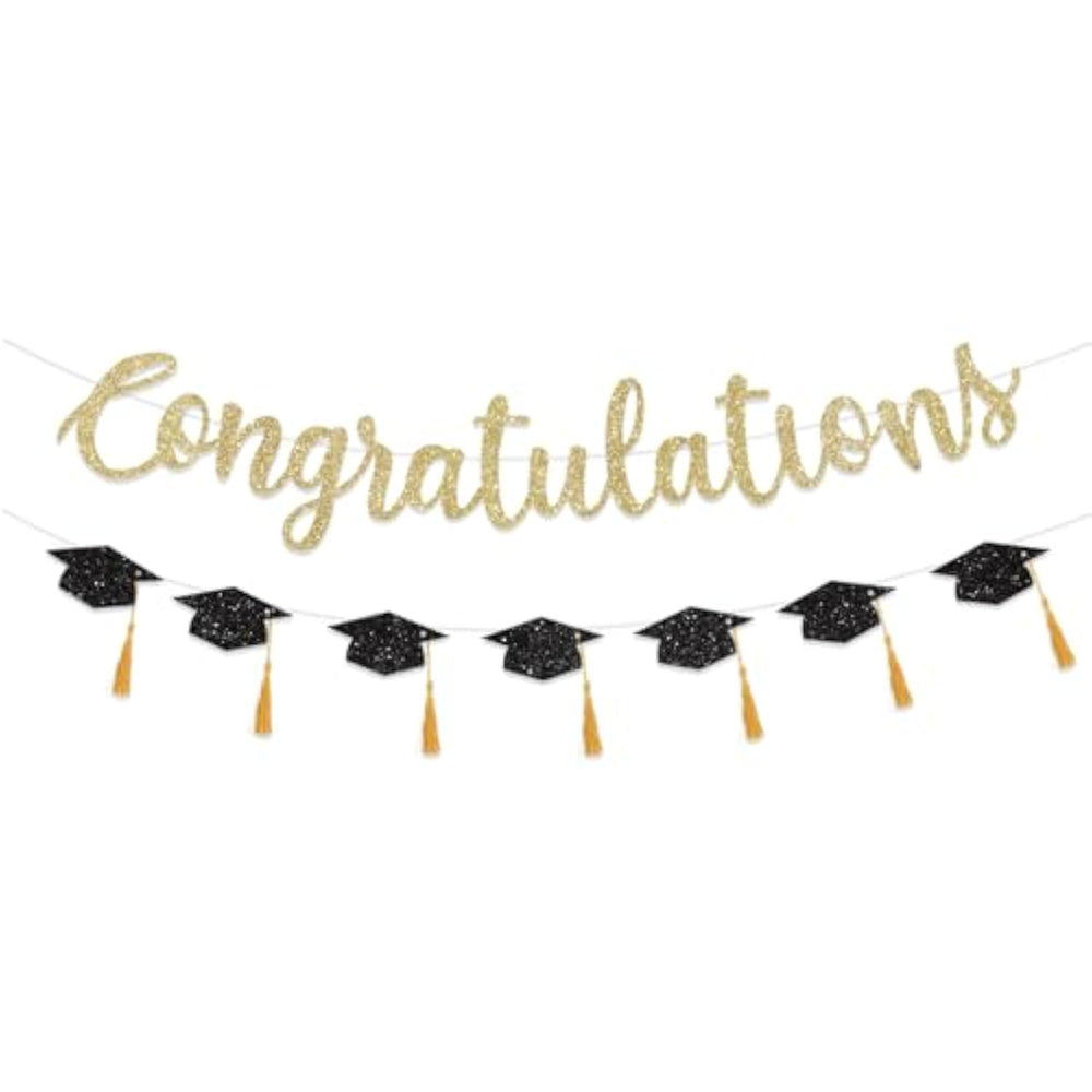 | Paper | | 1...Gold Gliter Paper Congratulations Banner, Prepare Particularly For Celebrating Graduation, Wedding, Retirement Party. | | 2...Package Include 15Pcs Of Letters And Graduation Cap Sign Banner 1 Pcs, You Can Easily Add Them To Mantels, Banisters, Windows, Dessert Tables, Or Even Use As A Photo Backdrop. | | 3... Need Diy: The Congrats Grad Sign Is Easy To Assemble With Plastic Needle, You Just Need To Use The Rope To Thread The Holes In The Card. His Cute Congrats Banner Is Not Only A Perfect Decor, But Also A Good Photo Props With Its Nice Cut Outs. | | 4... Reliable And Sturdy Material: The Graduation Banner Is Made Of Glitter Paper Material, Reliable And Sturdy, Not Easy To Break. So That You Can Easily Fold Up And Save For Future Celebrations! The Real Gold Glitter Adds The Perfect Touch To Your Retirement/Job Promotion/Opening/Graduation Party Decorations. | |