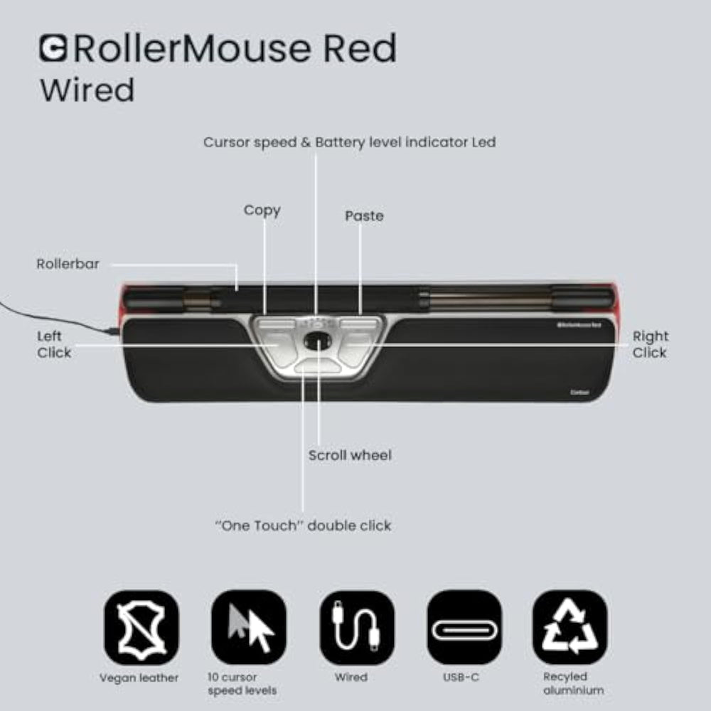 | ERGONOMIC, CENTRALIZED DESIGN: Rollermouse Red sits directly beneath your keyboard to eliminate reaching for a mouse. This centralized position helps keep your hands within shoulder width, reducing strain on your neck, shoulders, forearms and wrists. | | NO GRIPPING, LESS FATIGUE: The patented Rollerbar enables relaxed cursor control with fingers. You can slide the Rollerbar left and right, roll it up and down to move the cursor, and tap for single and double clicks. This removes the need to reach for, grip, or move a traditional mouse by hand; significantly reducing tension in your neck, shoulders, arms, and wrists compared to both standard and vertical ergonomic mice. | | RELIEF FOR RSI CARPAL TUNNEL: Rollermouse is designed to reduce repetitive movements, offering a healthier, more comfortable alternative for users experiencing discomfort or users with carpal tunnel, tennis elbow or similar conditions.? | | CUSTOMIZABLE WORKFLOW PRECISION: Rollermouse features 6 pre-programmed buttons for the most frequently used functions: Right Click, Left Click, Double Click, Copy, Paste, and setting the cursor speed level (DPI). These buttons can be reprogrammed to fit your work tasks, by using the Contour driver. The smooth scroll wheel is perfect for tasks that require precision such as data management. | | COMFORTABLE, DURABLE SUPPORT: Rollermouse Red includes an easily disinfected, detachable wrist support that provides optimal support for users with compact work space or keyboard trays. Constructed from durable memory foam, the wrist support puts users in an optimal posture, preventing strain and fatigue during long hours of use. | | DURABLE MAC/PC COMPATIBLE: With a robust aluminum build, easy-to-clean surface, and plug-and-play set-up for both Mac and PC, RollerMouse Red cable unit is with USB-C end-point, and the box includes a USB-A converter. | | SUSTAINABLE DESIGN WITH REPLACEABLE COMPONENTS: RollerMouse Red is built to last using durable materials, including post-consumer recycled plastic and recycled aluminum. Its replaceable components make it easy to repair, extend its lifespan, and reduce electronic waste. | |