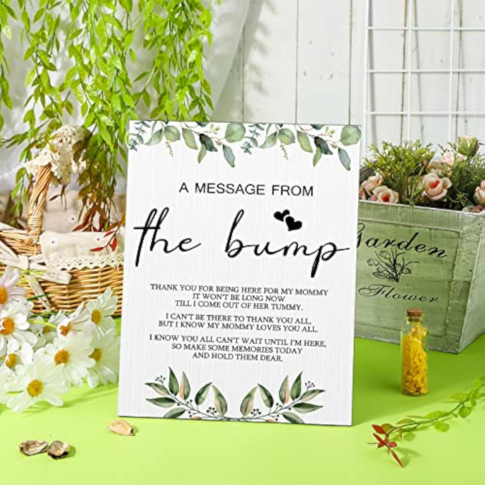 | Simple And Elegant Party Decor: You Will Receive 1 Piece Of Wooden Baby Shower Game Sign In The Package, Coming With A Holder At The Back, Easy For You To Stably Put It On The Table | | Large Size For Applying: The A Message From The Bump Wooden Game Sign Measures Approx. 28 X 22 Cm/ 11.2 X 8.66 Inches, And About 0.5 Cm/ 0.2 Inch In Thickness, Big Enough For You To See The Texts On The Surface Clearly, And Can Catch Others' Attention Quickly | | Serve You For A Long Time: Made Of Wood, The Cool Baby Shower Sign Decor Is Skillfully Polished, Exquisite Workmanship Makes It Have No Burrs, So That You Can Not Worry It Will Scratch Your Hands, Providing You With A Comfortable Using Experience | | Warm And Beautiful Design: Decorated With Green Leaves, The Baby Shower Game Sign Is Elegant And Attractive, And Can Bring More Color To Your Party; Besides, Its Surface Is Printed With Warm Words, Which Can Bring You A Moving And Fresh Feeling When You Read | | A Wide Range Of Applications: The Baby Shower Party Table Decor Is Suitable For Many Theme Parties, Such As Gender Reveal Party, Baby Shower, And More, You Can Also Use Them As Table Decors, It Can Leave Your Guests A Deep Impression | |