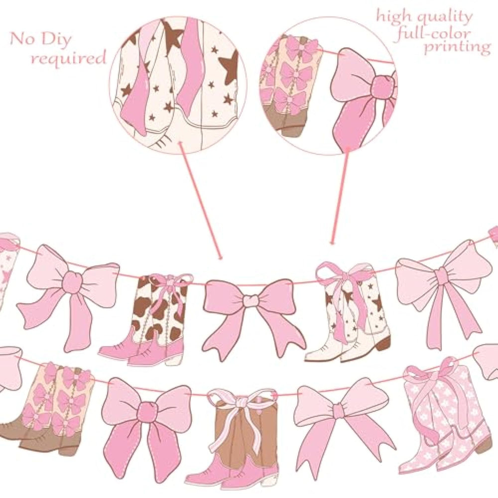 | Complete Party Decor?Pre-Strung Coquette Cowgirl Banner Featuring Alternating Pink Bows And Boots Designs, Perfect For Western-Themed Celebrations And Easy Setup | | Double-Sided Printing?Each Bow And Boot Cutout Banner Is Printed On Both Sides With Charming Details Including Star Patterns And Ribbons In Pink And Brown Hues | | Premium Quality?This Western Coquette Cowgirls Party Decoration Is Crafted From High-Grade Cardstock Materials Ensuring Durability Throughout Your Event | | Suitable Occasions?Ideal For Cowgirl-Themed Birthday Parties, Boots Or Bows Baby Showers, Gender Reveals, Or Any Western-Inspired Celebration Requiring Wall Or Backdrop Decor | | Ready To Hang?2Pcs Coquette Bow Cowgirl Banners Come Fully Assembled With Pink String Connecting All Pieces, Allowing For Quick And Hassle-Free Installation At Your Event | |