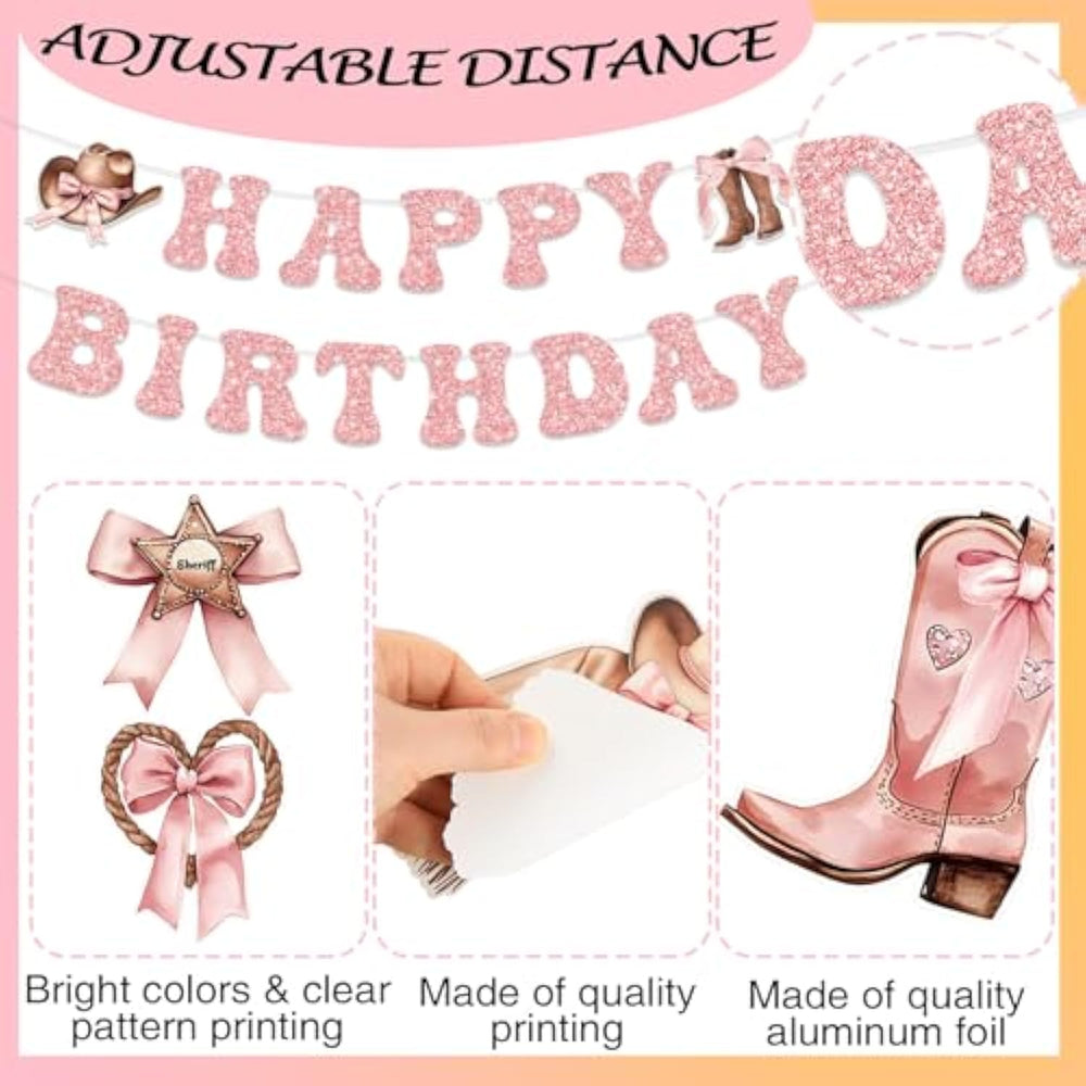 | Package: Offering A Comprehensive Package That Includes 2 Happy Birthday Banners And 10 Coquette Bow Cowgirl Cards, Our Pink Bow Decorations For The Party Ensure You Have Everything You Need To Create A Spectacular Party Ambiance | | Quality Material: Emphasize On The Quality And Durability Of Our Pink Coquette Birthday Decorations; Made From Sturdy Card Paper And Metal Foil, These Decorations Longevity And Elevate The Festive Spirit Of Your Special Day | | Versatile Party Decor: Whether It'S A Cowgirl Birthday Party, A Western Cowgirl Party, Or A Nashville Personalized Decor Theme, Our Versatile Bow Birthday Decorations Fit Seamlessly In All These Occasions; Their Adaptable Design Makes Them A Must-Have For All Party Adorers | | Ingenious Design: Our Innovative And Attractive Design Of Coquette Birthday Decorations Stand Out In Capturing Everyone'S Attention; Moreover, Our Birthday Banner Serve As Nice Photo Props, Creating Cherished Memories For The Birthday Guests | | Quality : We Stand By The Quality Of Our Cowgirl Birthday Party Decorations; We Ensure Nice Quality Control Procedures In Place, Promising You A Delightful And Memorable Birthday Celebration Without Any Worries | |