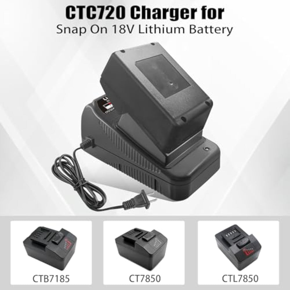 [Ctc720 Charger Replacement] Our Charger Is Compatible With Snap On 18V Lithium Batteries Ct7850, Cdr7850H, Ctl7850, Ctb7185, Ctb8185, Ctb8187. | | [Charger Specifications] Input: 120-240V Ac; Output: 18V Dc 2.0A. Plug: Us Plug. | | [Attention Please] Only Charge For Li-Ion Batteries, Not For Ni-Cr, Ni-Mh, Ni-Cd Batteries. | | Replace For Snap On Ctc720 Charger. Only Charge For Li-Ion Batteries, Not For Ni-Cr, Ni-Mh, Ni-Cd Batteries. | | This Charger Is Designed To Be Lightweight And Portable, Making It Easy To Take With You On The Go. The Led Indicator On The Charger Lets You Know When The Battery Is Fully Charged. | |