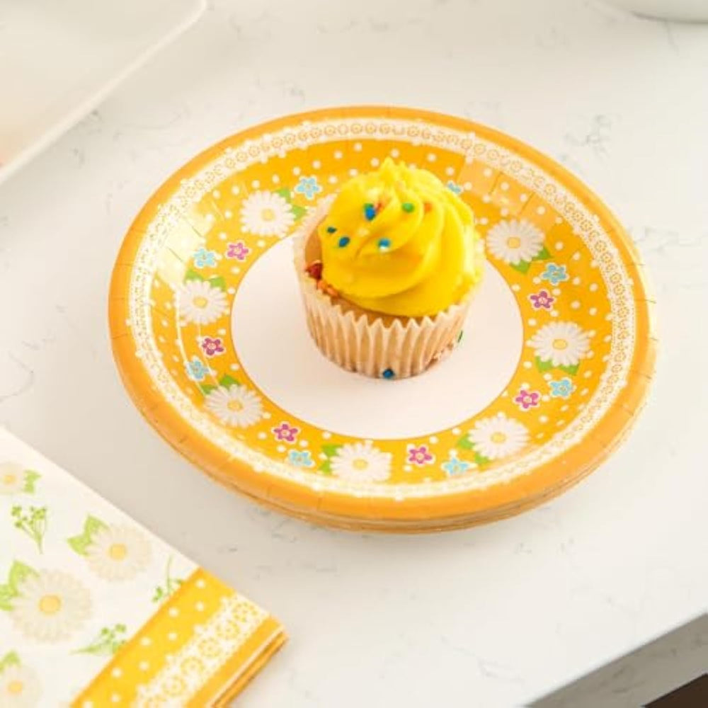 This premium yellow daisy floral party set serves 24 guests, featuring 9-inch dinner plates, 7-inch salad/dessert plates, 8 oz cups, and 3-ply folding napkins. Perfect for adding a cheerful touch to your celebration.