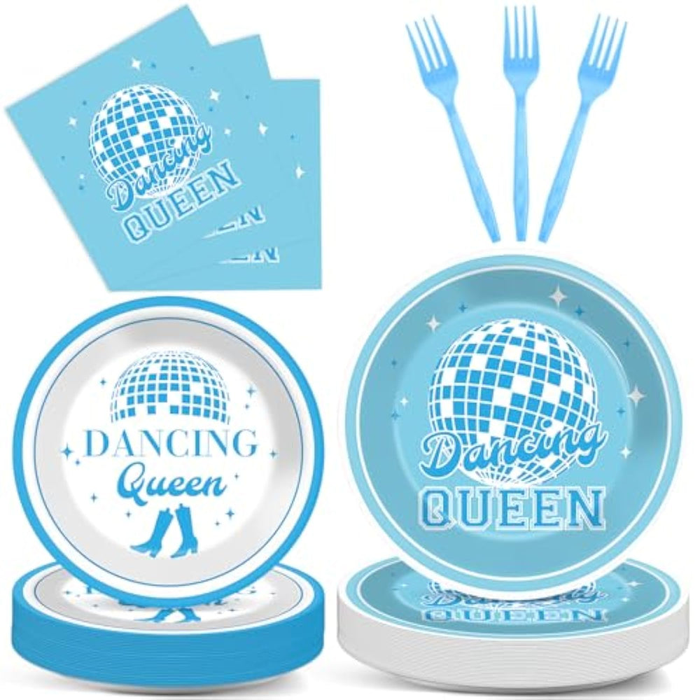 Get the party grooving with this 96-piece Dancing Queen disco party tableware set, perfect for 70s-themed celebrations, 17th birthdays, bachelorettes, and dance-inspired events. Serving 24 guests, the set includes dinner plates, dessert plates, napkins, and blue plastic forks, all featuring vibrant blue disco ball designs, dancing shoes, and “Dancing Queen” lettering for a fun retro vibe. Made from high-quality, sturdy materials, these disposable supplies offer easy cleanup, so you can spend more time dancing and less time doing dishes. Ideal for adding flair to any upbeat celebration