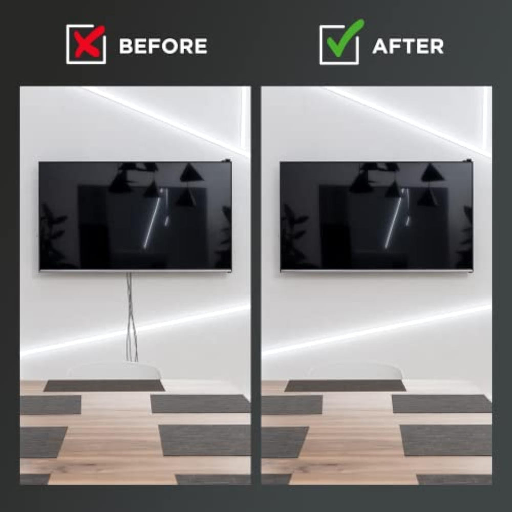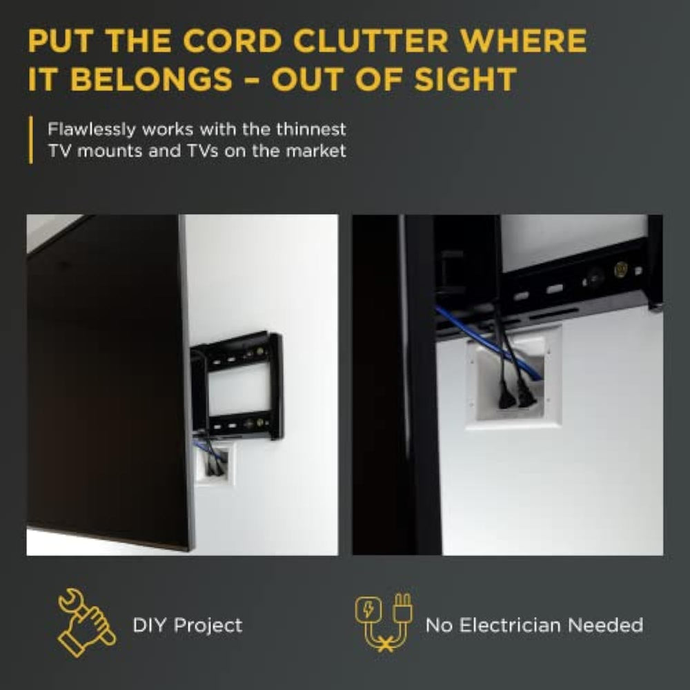 | CLEANER AESTHETICS: Dangling TV cables and HDMI wires look terrible even with the best home theater setup. Hide everything behind the scenes with our single receptacle power outlet relocation kit that is wired from existing power and acts as a new receptacle for flat TVs and wall-mounted electronics | | ADAPTABLE WIRE HIDING KIT: This behind-wall cable management kit allows you to position your TV and set-top boxes at a height that looks perfect. The cable pass-through openings in both plates are wide enough to handle multiple HDMI and A/V cables | | ROUTE THE CABLES: Ideal for flat TVs that have a power outlet behind them. Replace the old power outlet with our in wall power kit for mounting TV. Feed the HDMI or A/V cords through the top-plate groove then back out from the lower-plate pass-through | | 30-MINUTE INSTALLATION: Add additional power supply with the top plate with a power receptacle, and secure the connections. Cut a hole using the included template to install the lower plate for the HDMI or A/V cables to come out, and screw it in place with the mounting wings | | CERTIFIED SAFETY: This patented in wall TV power kit is RoHS compliant and is certified by ETL to UL standards for safe power routing. Crafted from sturdy plastic, the plates withstand daily wear and tear and offer years-long service | |
