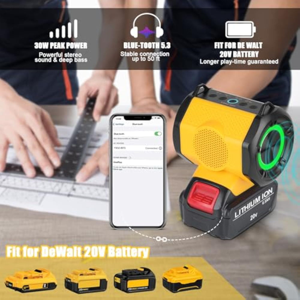 ?Compatible For De Walt 18V 20V Battery?The Blue Tooth Speaker Fully Fit For De-Walt 18V 20V Max Including 20-60V Lithium Ion Battery. You Can Plug In Your De Walt 18V 20V Dcb204 Dcb206 Battery To Enjoy The Ultimate Stereo Sound. | | ?Dual Tws Pairing?Support Dual Speaker Connection Which Allow Two Speakers Are Connected To One Blue Tooth Device Simultaneously. Enjoy Panoramic Surround Music And Stereo Sound. Perfect For Worksite, Camping, Party, Outdoor, Gaming, Music And Movie Playback. | | ?Upgraded Blue Tooth 5.3?Speaker Support Blue Tooth And Usb Audio Disks Source. Wireless Blue Tooth Speaker Can Connect The Device From Up To 52 Ft. The Blue Tooth 5.3 Chip Easily Reads The Music Playlist And Connects Such As A Smartphone, Tv, Or Laptop. | | Compact Size: Small Size Similar With One Pack For De Walt 20V 6.0Ah Battery Pack, And Less Lighter Than For One Pack De Walt 20V Battery. But Could Provide Powerful Sound, Help You To Enjoy Music Anytime Anytime Anywhere. | | Extr.