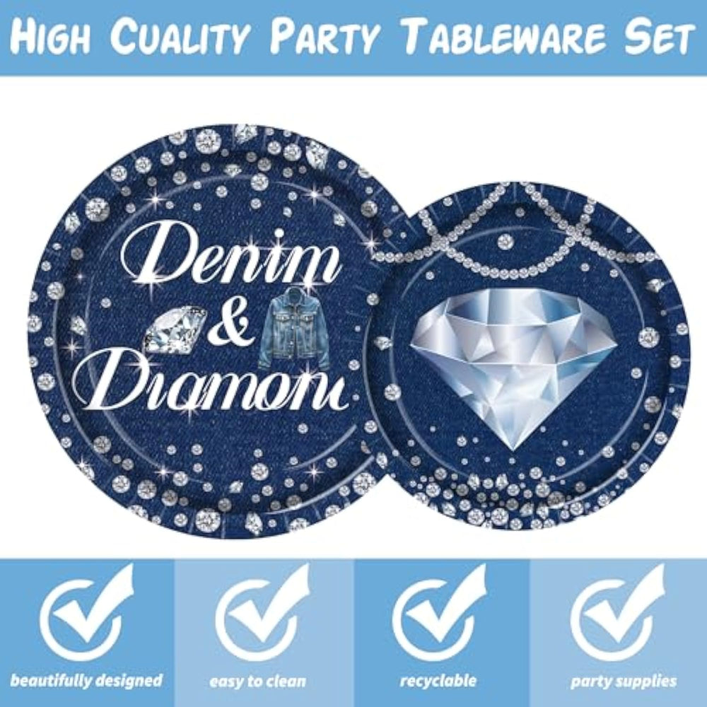 | Complete Set?Package Includes 96-Piece Denim And Diamonds Tableware, Includes 48 Plates (24 Each Of 2 Designs), 24 Navy Blue Plastic Forks, And 24 Napkins For Your Celebration | | Flashy Design?This Denim And Diamonds Birthday Party Supplies Features Sophisticated Motifs With Sparkling Diamond Graphics And Jean-Inspired Patterns On Navy Blue Backgrounds | | Plate Specifications?Each Plates Come In Two Stylish Designs - One With A Large Diamond Centerpiece And Another With 'Denim Diamonds' Text | | Perfect For Occasions?Ideal For Denim And Diamonds Themed Parties, Diamond Birthday Parties, Bridal Showers, Bachelor Parties, Crystal Party And Upscale Casual Celebrations | | Premium Quality?The Plates, And Napkins Of The Denim Jeans Tableware Are Made Of High Grade Paper Material, And The Fork Is Made Of Thick Plastic. Perfect Complement For A Cohesive Table Setting | |