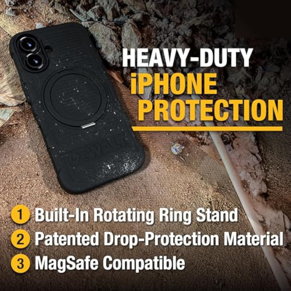 | 360° Rotatable Magnetic Ring: Fully adjustable for a secure grip, hands-free stand functionality, and seamless MagSafe compatibility | | Heavy-Duty Drop Protection: Engineered with shockproof nanobubbles to absorb impact and protect your i phone16 pro max case from drops and bumps | | Built-In Stand Ring Holder: Functions as a sturdy kickstand for hands-free viewing and as a secure grip to prevent accidental drops | | MagSafe Compatible: Strong magnetic attachment ensures effortless wireless charging and compatibility with MagSafe case iPhone 16 accessories | | Durable Rugged Design: DEWALT’s signature tough construction ensures long-lasting cases for iPhone 16 protection in any environment | |