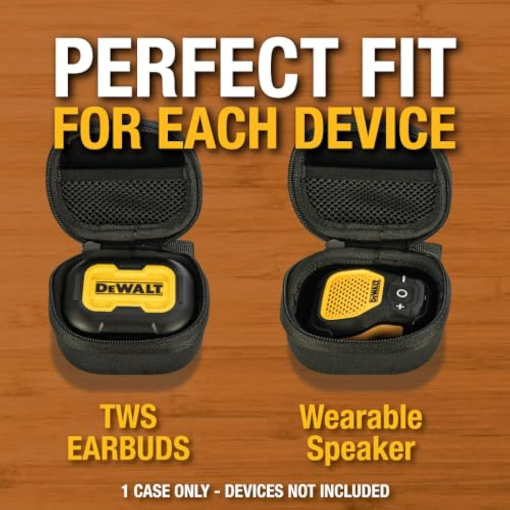 | Ultimate Protection for Your Audio Gear: Durable headphone bag specially designed to fit DEWALT TWS Earbuds and DEWALT Wearable Speaker, keeping your device secure and protected (holds one device at a time) | | Ruggedized EVA Outer Hard Shell: Built with high-quality EVA material, this headphone storage absorbs shocks, repels water, and guards against dust, ensuring long-lasting performance for headphone case travel | | Secure Compact Design: Lightweight yet rugged, the compact headset case size makes it easy to carry in a backpack, toolbox, or work bag without adding bulk | | Soft Interior Mesh Pocket: Snug-fit, soft interior cradles your device to prevent movement, while the integrated mesh pocket stores accessories like cables and extra ear tips, making it the perfect all-in-one headphone carrying case | | Built for the Job Site On-the-Go: Whether at work, on the road, or at home, this wireless headphone case offers the durability and convenience DEWALT users expect | |