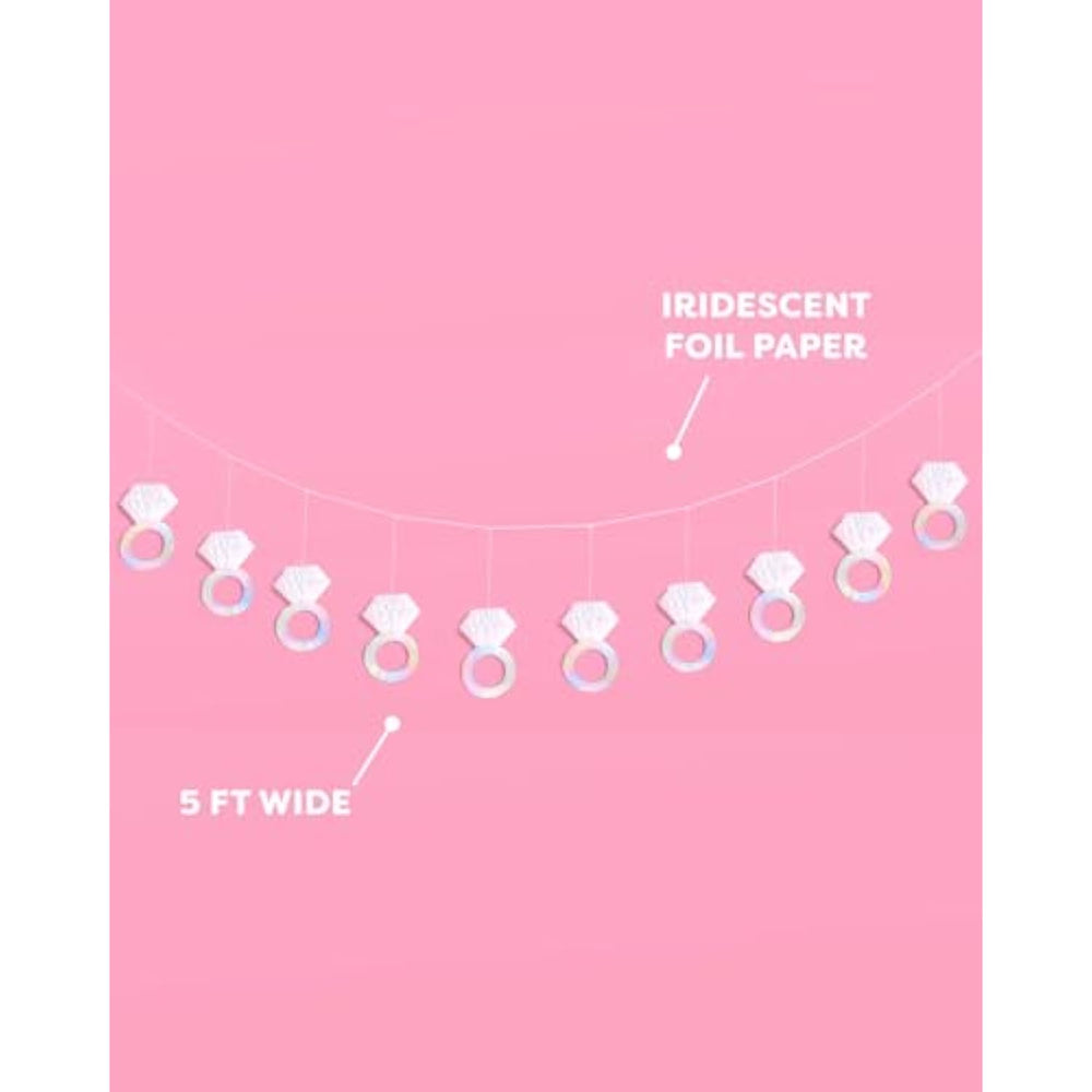 | Bride To Be: Our Iridescent Foil Banner Includes 10 Diamond Rings And Is The Party Addition You'Ve Been Looking For + A Hit! | | Foil Details: Each Banner Features A Silver Iridescent Paper Finish With White Tissue Accordion Diamonds - Think Super Fun + Cute! | | For Every Event: One Size Fits All! Perfect For Any Bachelorette, Bridal Shower, Proposal Or Engagement Party Photo Booth! | | Ready To Party: This Banner Is Pre-Strung On One White String And Ready For Action! | | Size: Each Set Comes With One Banner With 10 Diamond Ring Icons And Spans 5 Feet Total. | |