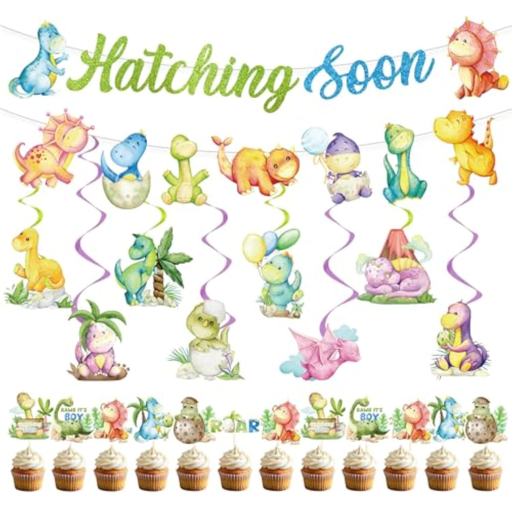 | What You Get: You Will Get The Dinosaur Baby Shower Decorations Set, The Set Includes 2 Pieces Of Hatching Soon Party Banners, 8 Pieces Of Dinosaur Themed Hanging Swirls, And 12 Pieces Of Dinosaur Cupcake Toppers, A Total Of 22 Pieces! Hatching Soon Baby Shower Decorations Are Adorable In Design And Perfect For Baby Shower Parties! | | Hatching Soon Theme: Dinosaur Baby Shower Decorations Is A Very Interesting Design That Combines Baby Shower Party Decorations With Baby Dinosaurs That Are About To Hatch, Whether It'S Banners, Hanging Swirls, Or Cupcake Toppers, They Are All Uniquely Adorable And Fun, And Can Help You Create A Fun Party! | | Easy To Use: The Dinosaur Baby Shower Decorations Are Very Easy To Use! The Banner As Well As The Cupcake Toppers In Hatching Soon Baby Shower Decorations Are Already Pre-Assembled For You, So When You Get Them You Can Enjoy The Party Without Spending Time On Assembly! The Dinosaur Hanging Swirls Are Also Very Easy To Assemble! | | Baby Shower Party Choice: Dinosaur Baby Shower Decorations Are Adorable And Plentiful In Design, Combining Well With The Theme Of Hatching Soon, Perfect For Dinosaur Themed Baby Shower Parties, Gender Reveal Ceremonies, And Other Occasions, Which Can Bring Unique Joy To You And Your Guests! | | Widely Applicable: Dinosaur Baby Shower Decorations Are Uniquely Designed And Abundant, Making Them Ideal For Dinosaur-Themed Baby Showers, Gender Reveals, And Other Related Parties. Hatching Soon Decorations Serve Perfectly As Dino-Themed Accents For Baby Showers And More! | |