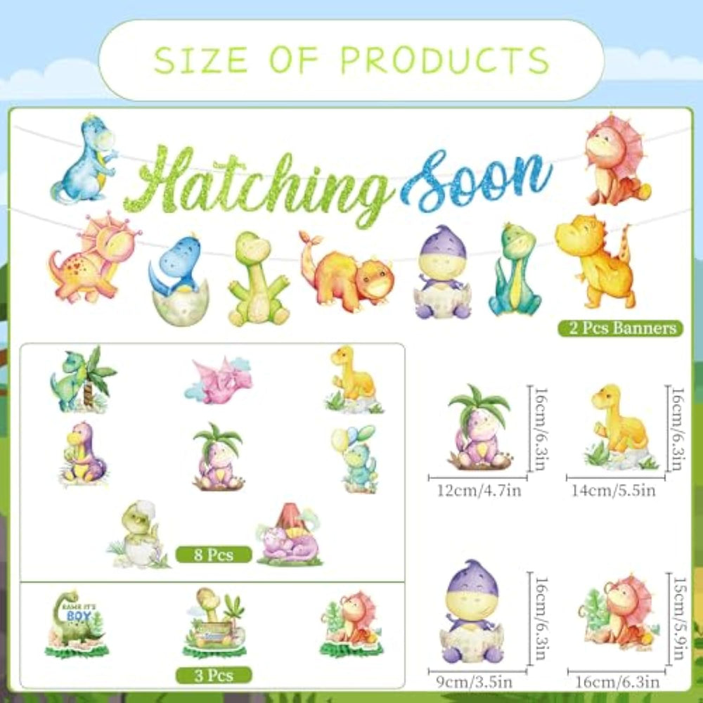 | Paper | | Dinosaur Baby Shower Decorations: This Set Of Dinosaur-Themed Baby Shower Decorations, Including 2 Banners, 8 Paper Card Hanging Swirls And 3 Honeycomb Decorations, Is Themed With Various Cute Dinosaur Images, Adding A Touch Of Cuteness And Fun To The Baby Shower. | | Easy To Use: The Baby Shower Banner Is Pre-Assembled, And The Hanging Swirls And Honeycomb Decorations Require Simple Installation, Allowing You To Quickly And Easily Decorate A Cute Dinosaur-Themed Baby Shower. | | Occasions Of Use: This Set Of Decorations Is Not Only Suitable For Dinosaur-Themed Baby Showers, But Also For Other Celebrations, Such As Boy Baby Showers, Animal-Themed Baby Showers, And Jungle-Themed Baby Showers. | | Cartoon Design: The Banner Is Themed With Hatching Soon, And The Hanging Ornaments And Honeycombs Are Cute Dinosaur Patterns, Which Bring Fun And Creativity To The Party And Immerse Guests In A Joyful Atmosphere. | | High Quality: The Card Patterns Of The Hanging Ornaments And Honeycombs Are Both Double-Sided Printed, And The Quantity Is Sufficient And The Variety Is Rich, Making The Entire Party Scene Look More Complete And Attractive. | |